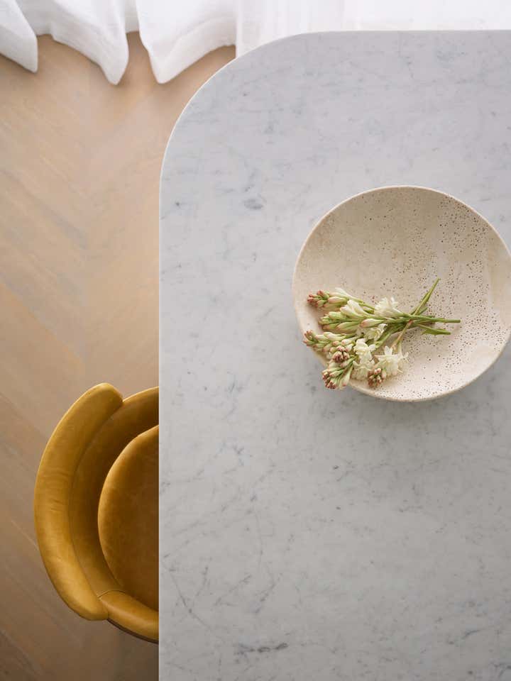 Curves are a highlight in the hand-carved grey Carrara marble kitchen island, and on the bathroom walls, covered in delicate mosaic finger tiles. Designed on organic lines, the master ensuite features a walk-in robe, free-standing bath and luxuriously furnished living area. That blend of luxury and comfort continues throughout the apartment, with curves and colours working together to create a sophisticated yet serene space.