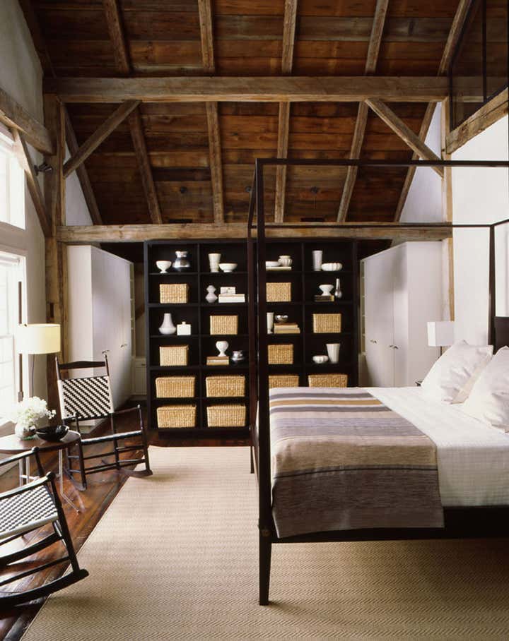The original naturally distressed wood beams and wide-plank flooring were offset by an eclectic combination of custom and vintage furniture, patina finishes, and heavily textured fabrics. Combined with refined detailing, extensive cabinetry and state of the art audio-visual systems, the result is a rustic, yet glamorous and comfortable, setting for family, friends, and household pets.