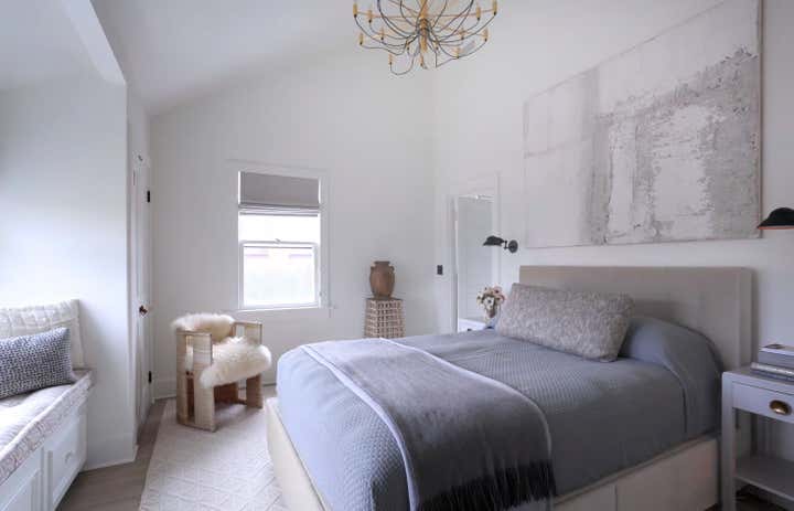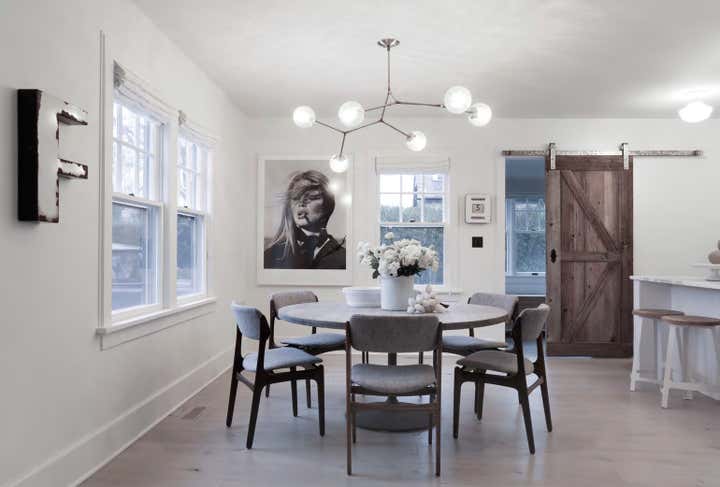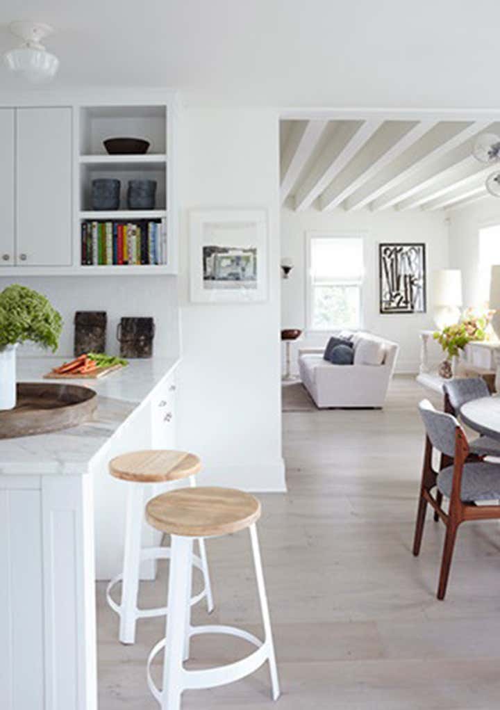 A soothing color of white, beige and blue-gray throughout the home lends a soothing sense of understated elegance tailored to the owners’ chic personal style. Milk-glass fixtures in the kitchen as well as the silvery-gray hue of the wood flooring, reclaimed from a barn in Vermont and stained in a chalky gray have a similar effect.