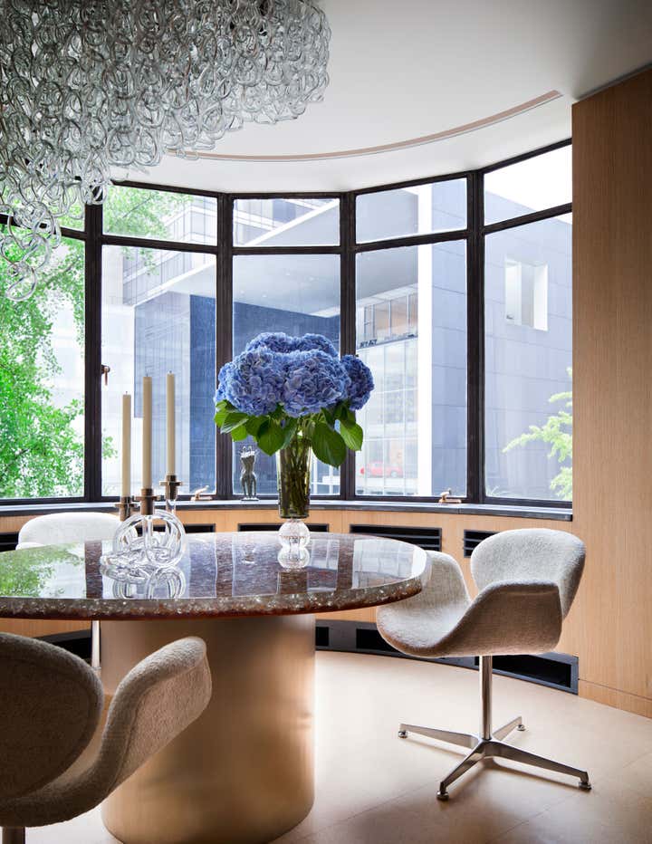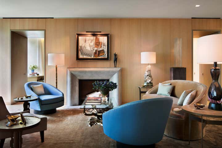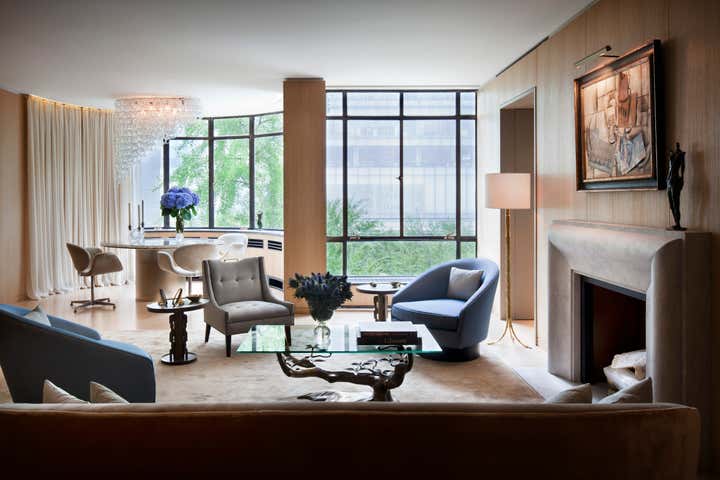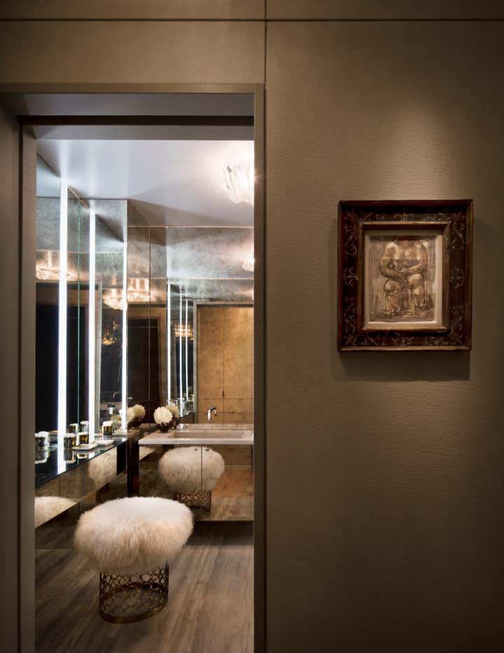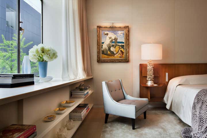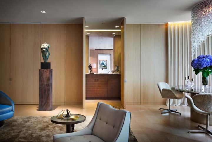 A 900 square-foot pied-à-terre in the historic Rockefeller Apartments building required careful attention to interior detail at an intriguingly minute scale. This jewel box with views overlooking the sculpture garden of the Museum of Modern Art manages to be both glamorous and subtle without being loud or austere. The living room, with its pale wood tones and lively mix of colors and textures, is punctuated by shapely furnishings, sculptures, and the client s own collection of vintage glass and metal pieces; muted cork floors are blanketed by a custom-colored silk rug. The bedroom, with walls clad in a serene beige silk, acts as counterpart to the exuberant living room. No detail in the scrupulously efficient apartment was left unconsidered; even the dressing room is covered in an ivory-color faux ostrich and the interiors of the antiqued-mirror cabinetry are a particular shade of coral custom-chosen to match the client s favorite Yves Saint Laurent perfume.