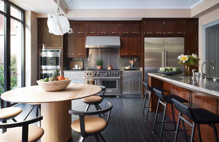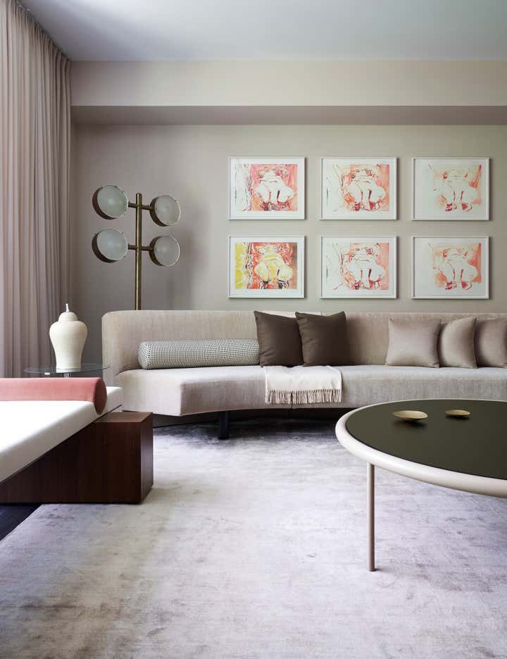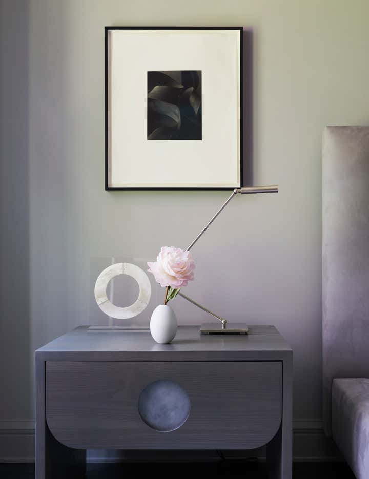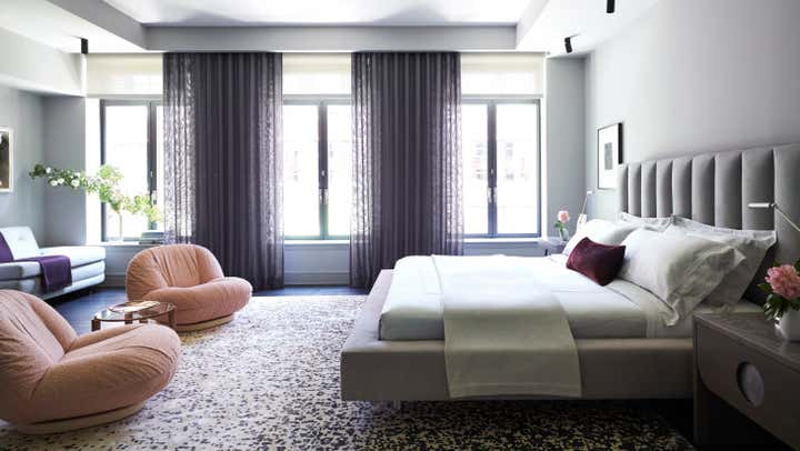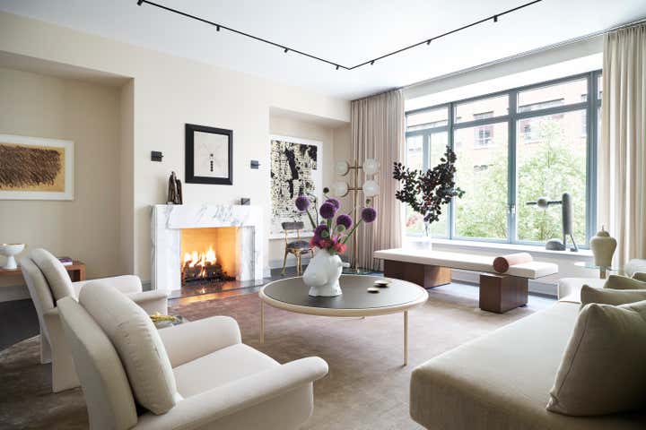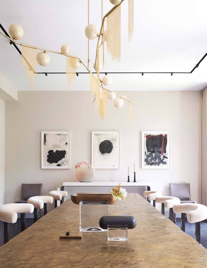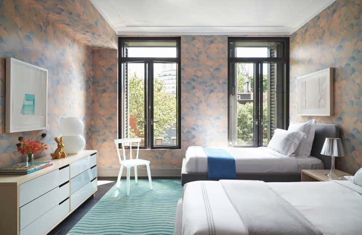 This expansive Lower Manhattan residence is imbued with rich atmospheric nuance. The five-story home has been designed entirely around the principle of a vertical chromatic temperature gradient. The earthen reds and peach hues of the garden and parlour levels give way to the subdued grays of the master suite, the playful greens of the children’s level, and the cool blues of the penthouse. The design throughout is both keyed to and augmented by works drawn from the illustrious and eclectic art collection of the client.