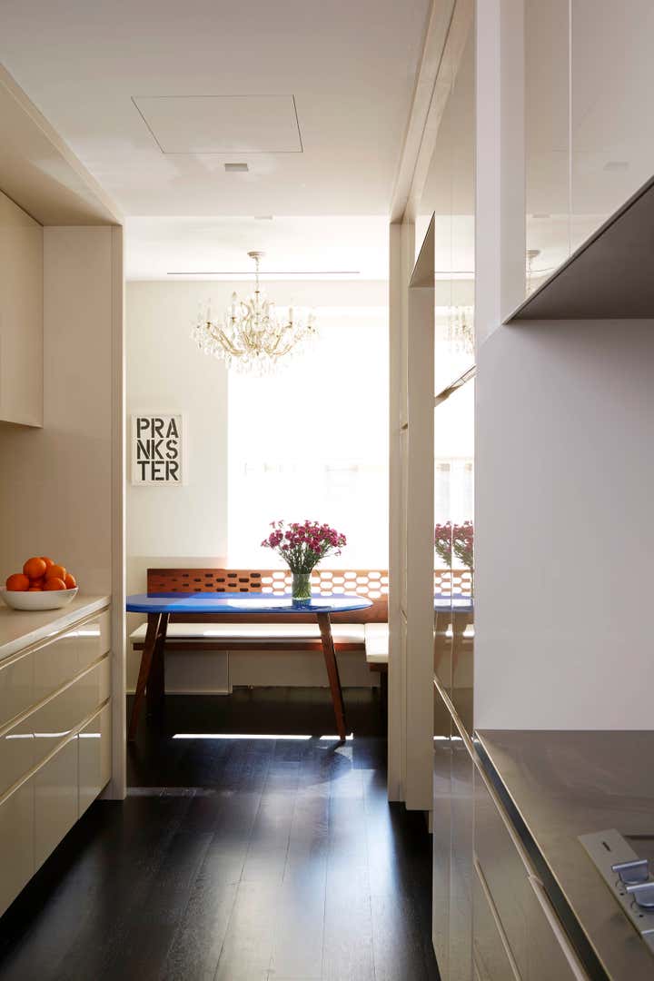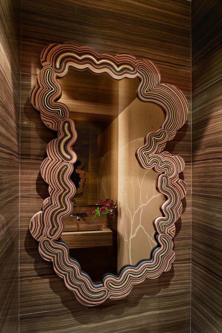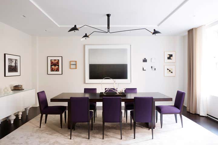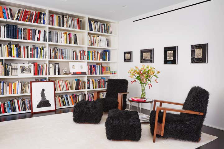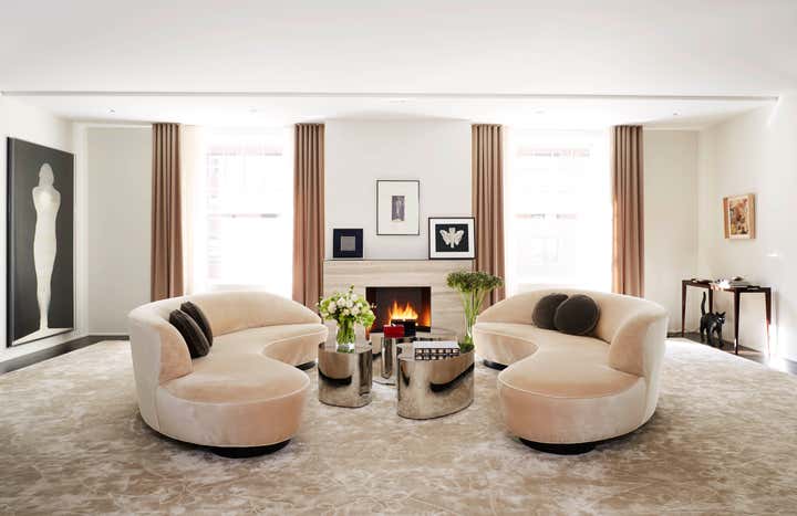 "A gut renovation in which four existing bedrooms were reconfigured, among other changes to the floor plan. The library was opened to create a gallery-like sequence with the living and dining space. The apartment relies on a handful of statement pieces—including a graceful Patrick Naggar daybed paired with shaggy black lounge chairs in the library and kidney-shaped Vladimir Kagan sofas that face each other across a trio of curvy mirrored cocktail tables by artisan Silas Seandel in the living room."