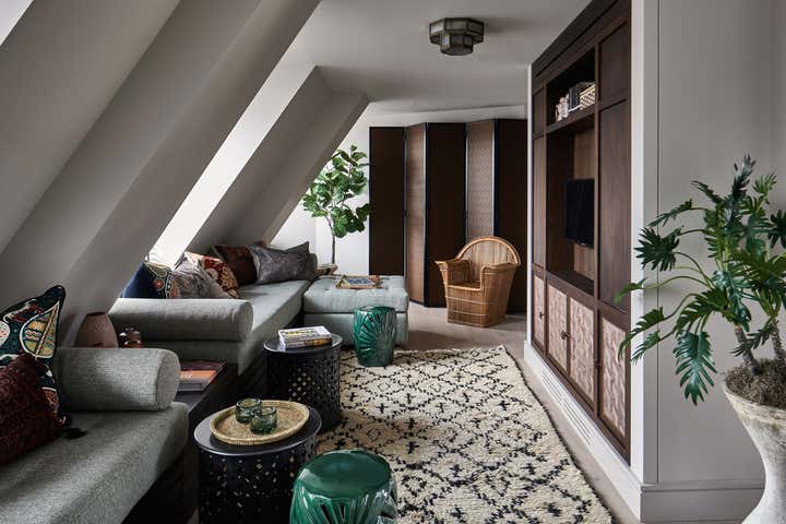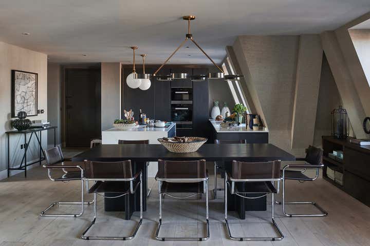 Located in one of London’s most prestigious locations, a stone’s throw away from the city’s key landmarks, the design of this three-bedroom split-level penthouse was inspired by the capital’s cultural diversity. Drawing on Britain’s traditions of decoration and craftsmanship, as well as the multicultural mix of influences that defines the capital, the property is a marriage of ideas, styles, cultures and eras balanced with a contemporary edge. Whilst the upper floor is comprised of an open plan kitchen, living, dining, and study area, surrounded by a palatial entertaining terrace, the lower floor houses the three ensuite bedrooms to ensure a feeling of privacy. Each room combines a multitude of pieces – from quintessentially British furniture, to fine Italian fabrics, classic Danish chairs, Afghan kilims, and African baskets.