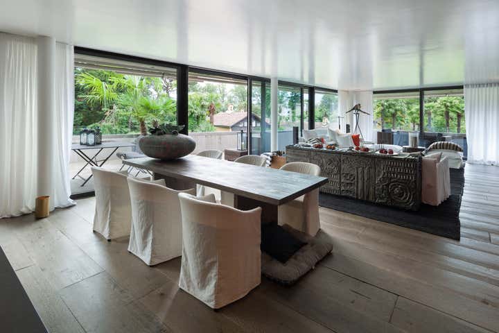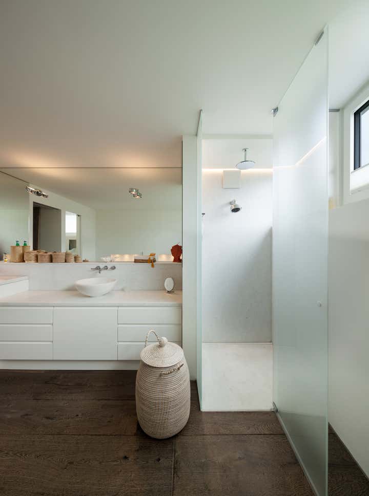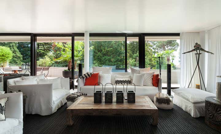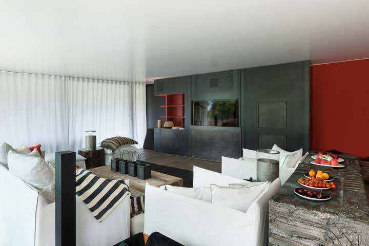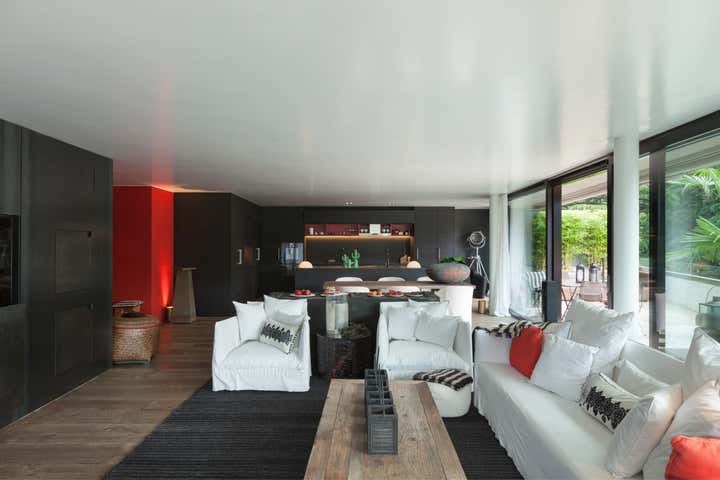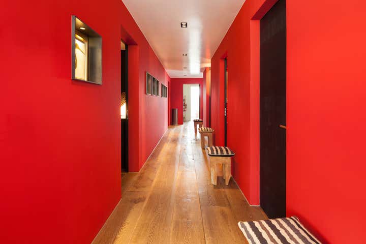 The home is filled with bold colors and pieces. The purpose was to give character. The simplest part of the home is the white bathroom. It fits well with the home even thought there is little color. The red hallway is a statement piece that takes you to the living space. I love the kitchen because the black brings out the bright colors. And the living room plays well with mixing the reds blacks and whites.