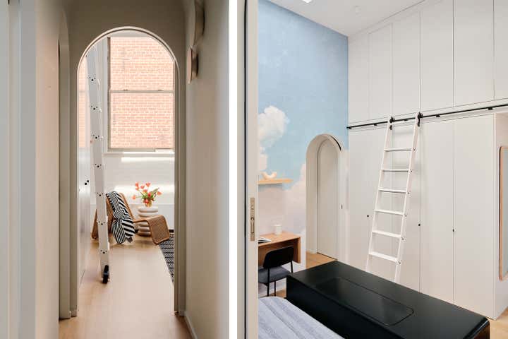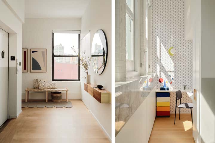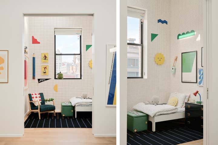 The top floor of a 1900’s landmark cast-iron building was transformed into a playful and modern home for a young family of four in NYC’s Tribeca neighborhood. This non-traditional family home is a bright, spacious and versatile loft that allows both for intimacy and social interaction. Design highlights include restoring the building’s original skylights, creating three separate bedrooms, adding an arched tunnel that can be closed off to separate the social and private areas, and using colors and patterns that reflect the clients’ young personalities.