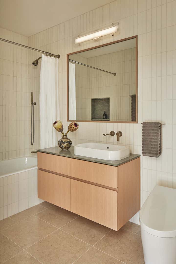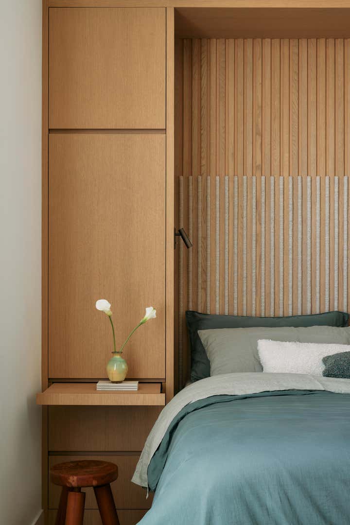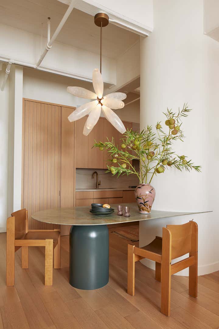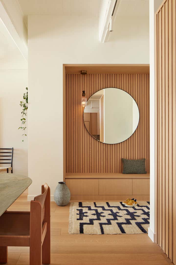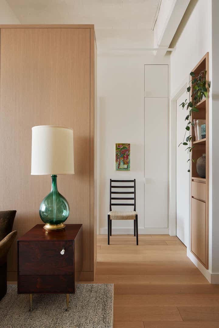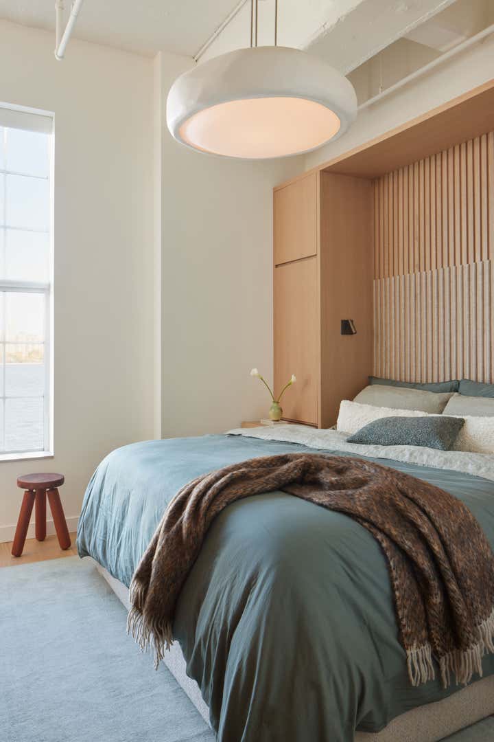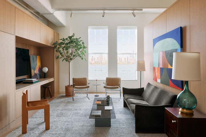 An contemporary, sun-filled studio overlooking the Brooklyn waterfront that is packed with smart hidden storage, custom millwork, vintage furniture, and an updated layout that maximizes every inch of the 870 square foot apartment.