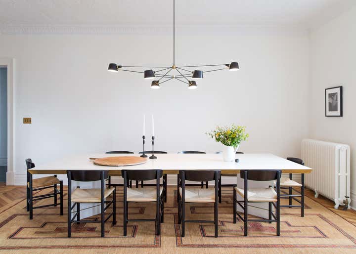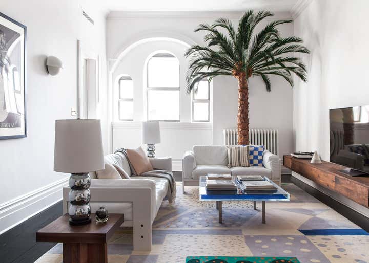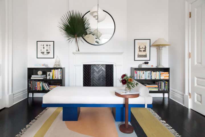 The timeless backdrop plays off the modern mix of furniture White Arrow designed, customized, and sourced. The home features contemporary and classic brands such as Tobia Scarpa, Stilnovo, Yves Klein, Paul McCobb, Milo Baughman, Brendan Ravenhill and Calico Wallpaper.