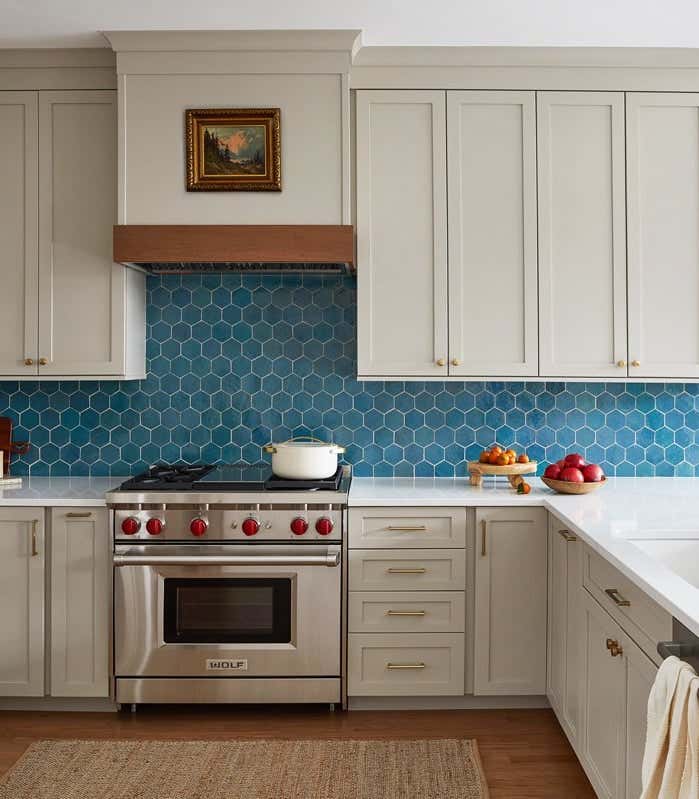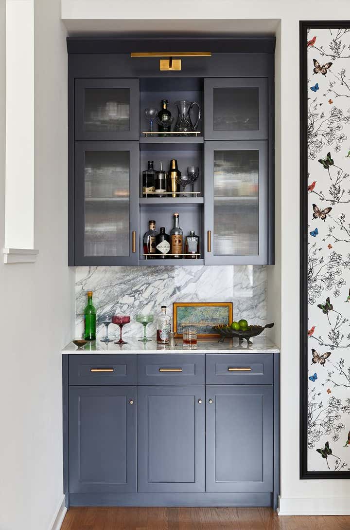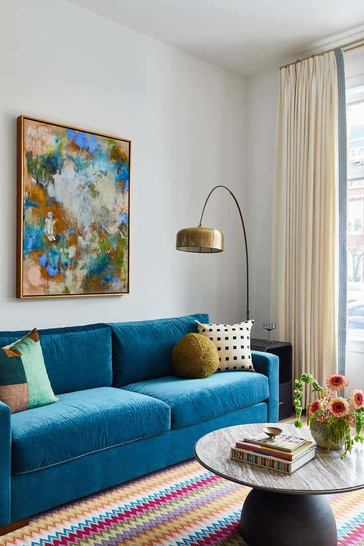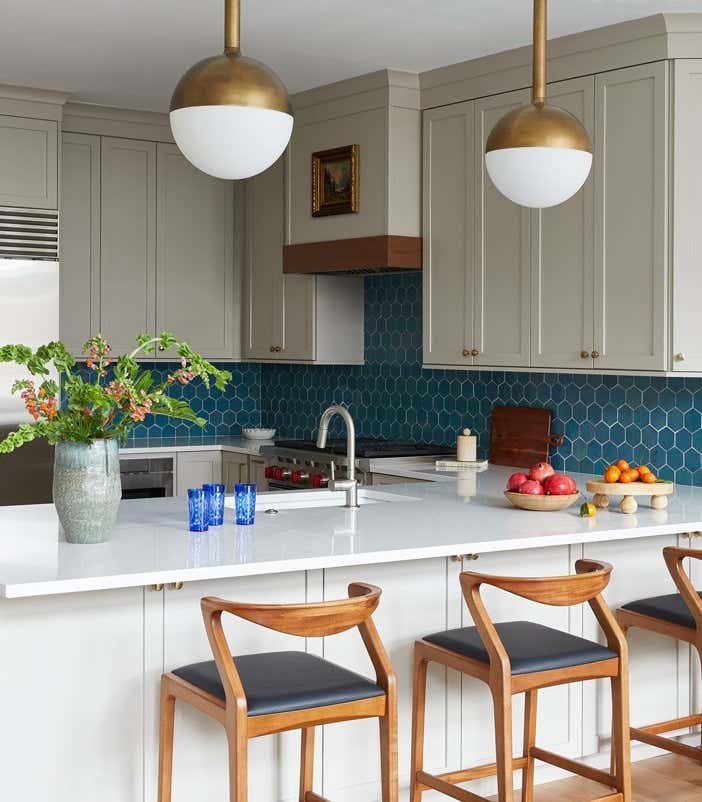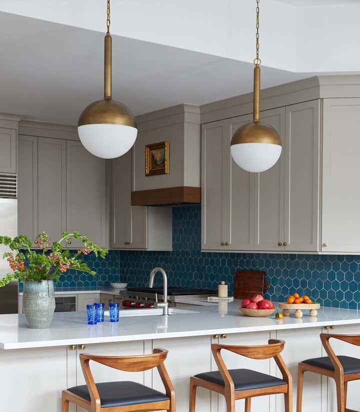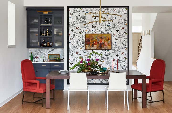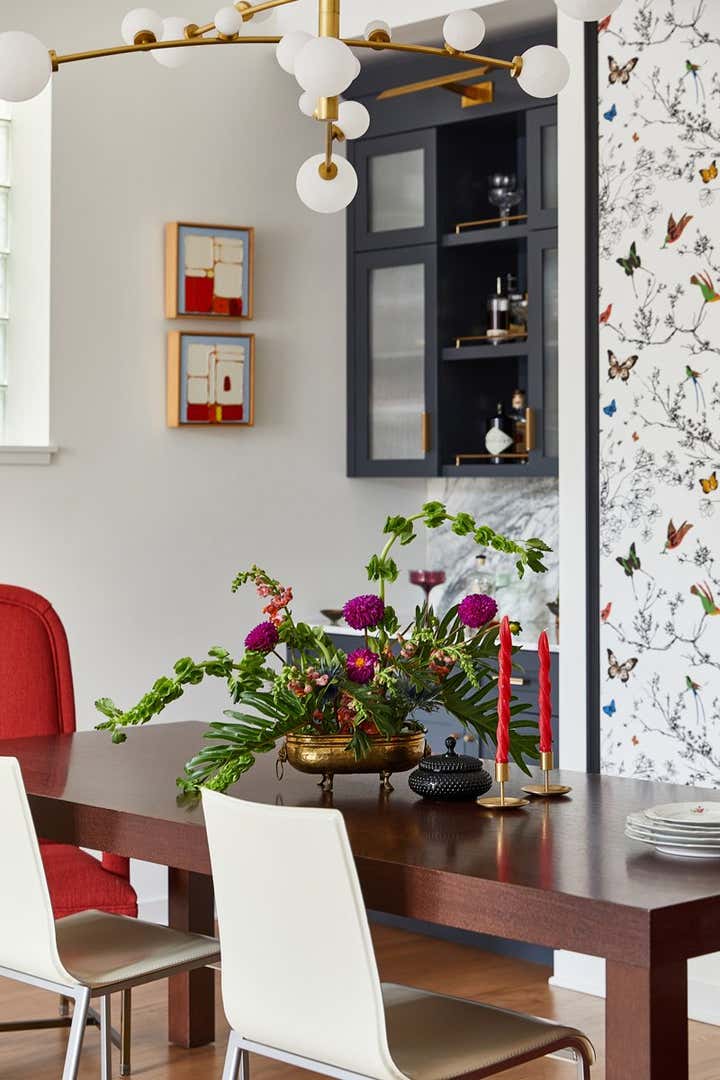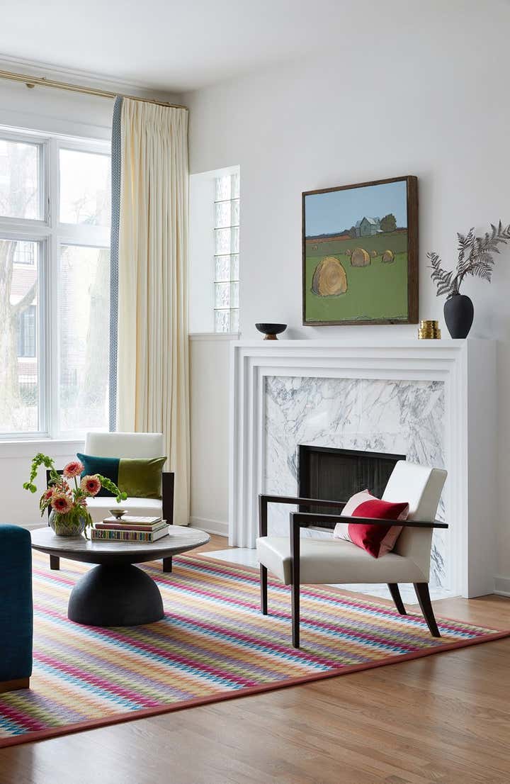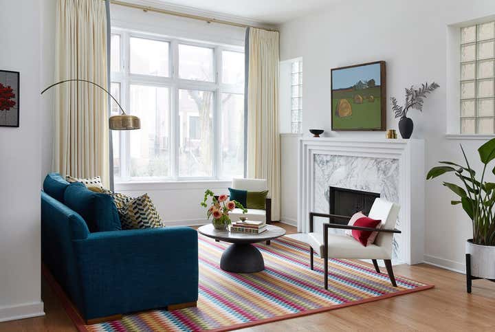 The Bucktown neighborhood of Chicago was just starting to blossom when this home was built, boasting modern 1990 s design. Fast forward to today and enter the stage: a pair of empty nesters, seasoned dwellers of this abode for over two decades. Feeling the itch for change, they worked with us to transform the first floor including living/dining room, kitchen/family room and powder room. We started with a blank slate armed with only the glass block windows and the client s own art collection and love of bold color and pattern. A new fireplace and dry bar pave the way for luxe velvets, color blocking, bright boucle and a Missoni carpet. The kitchen got a gut with all new cabinets, countertops and appliances. This heart of the home lives somewhere in the middle of modern and traditional with shaker cabinets and imperfectly perfect Zellige tile.