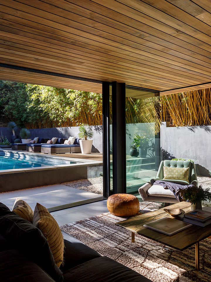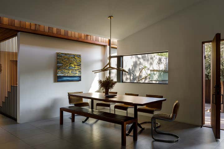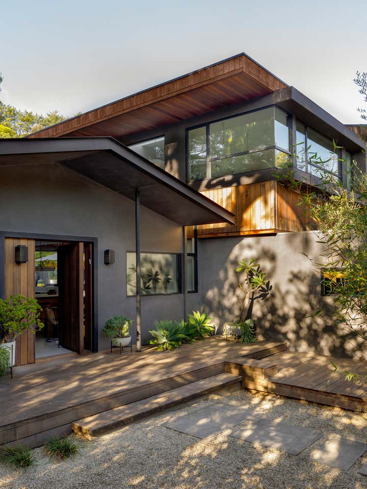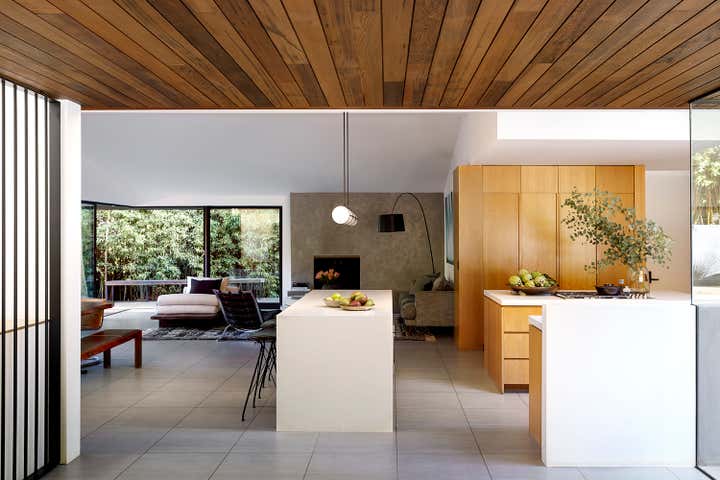Perched in Laurel Canyon, the Wonderland Park Residence reimagines a 1956 ranch house with a modern second-floor addition and extensive remodel inspired by its mid-century surroundings. A thirty-foot skylight connects the original pitched roof to the new addition, filling the home with natural light and accentuating the Western Red Cedar cladding that flows from the interior to the exterior.