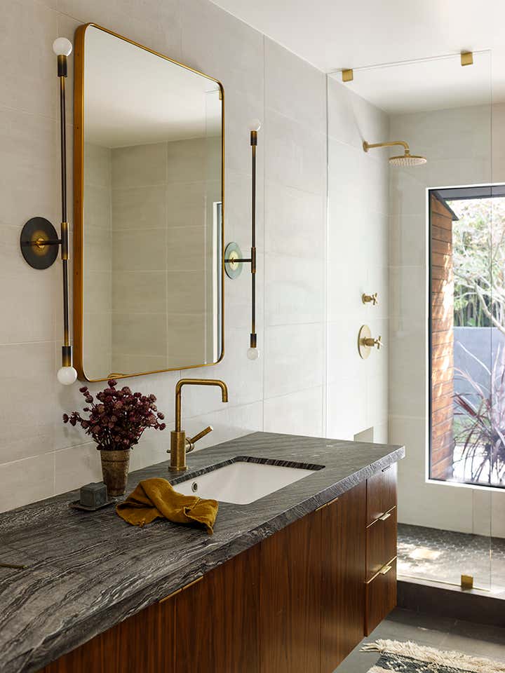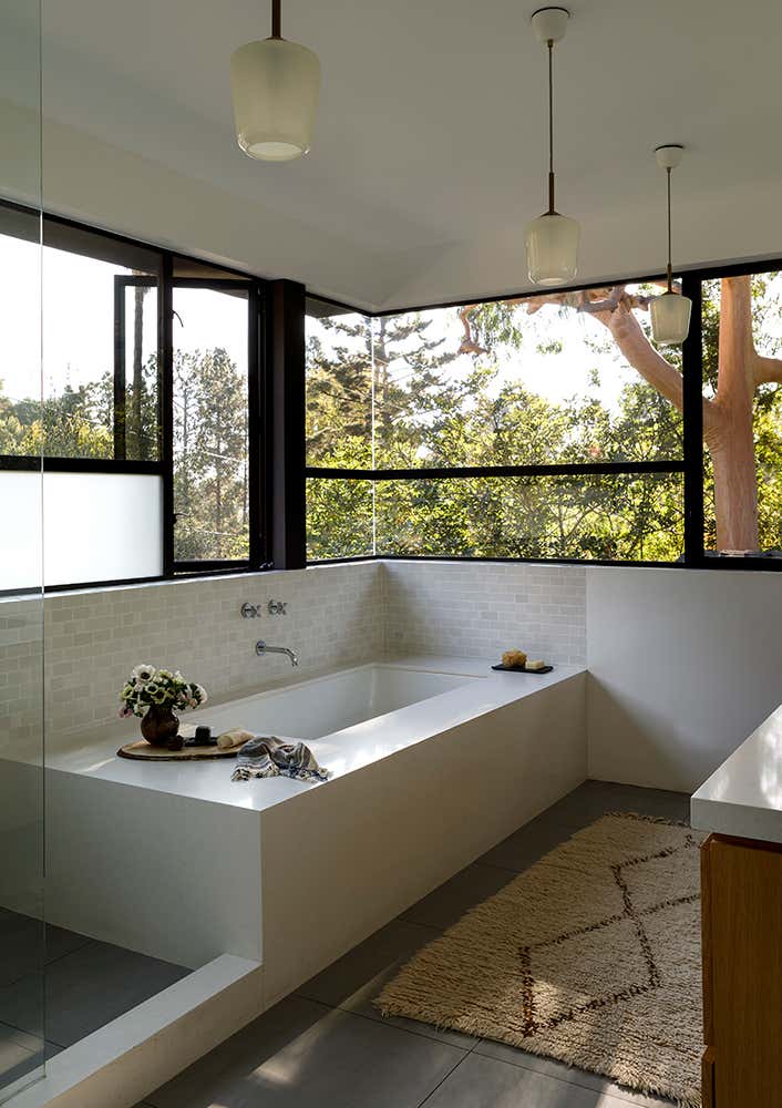 The kitchen anchors the home, linking social and private spaces while offering expansive views of the landscape and sky. Floor-to-ceiling sliding glass doors create a seamless connection from the front yard through the interior to the backyard and pool, while upstairs, the primary bedroom and bath offer sweeping views of the canyon.
