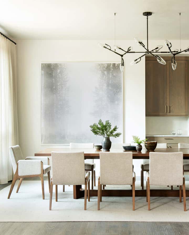 When our longtime client purchased a vacation home at the exclusive Yellowstone Club we couldn’t wait to customize the 7,000 square foot space for their cosmopolitan family. We layered in sophisticated contemporary furnishings in saturated jewel tones with playful patterns, hand-painted wall treatments and statement lighting for a stylish (but not too serious) mountain retreat. Sculptural sofas flank the fireplace in the formal living room with walnut and steel coffee tables and artwork by Melissa Dickenson. The warm, neutral palette continues in the dining room which features a walnut table with brass inlay, oversized artwork and a dramatic light fixture.