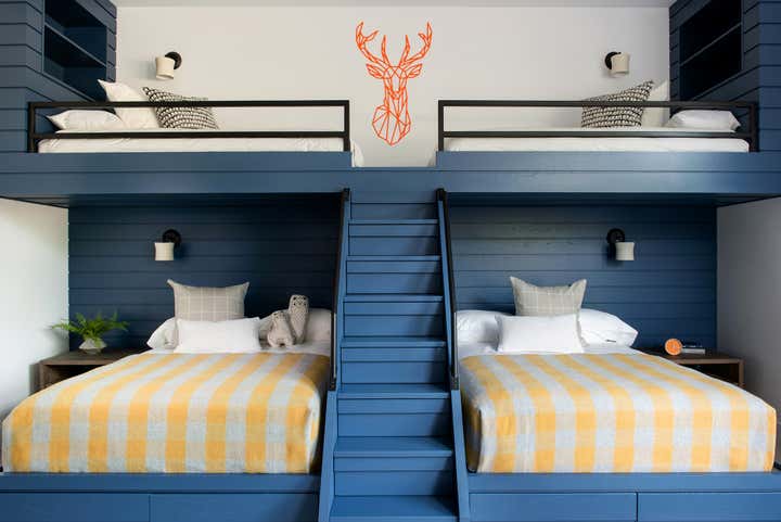 Hand-painted walls by San Francisco artist Caroline Lizarraga serve as the backdrop in the luxe primary bedroom as well as in the office. The media room features a modular 7 piece sectional which provides flexible lounging for movie watching and playing games. We optimized the home to accommodate frequent houseguests, with custom double queen beds in the guest rooms and a bespoke bunk bed in the kids bedroom.