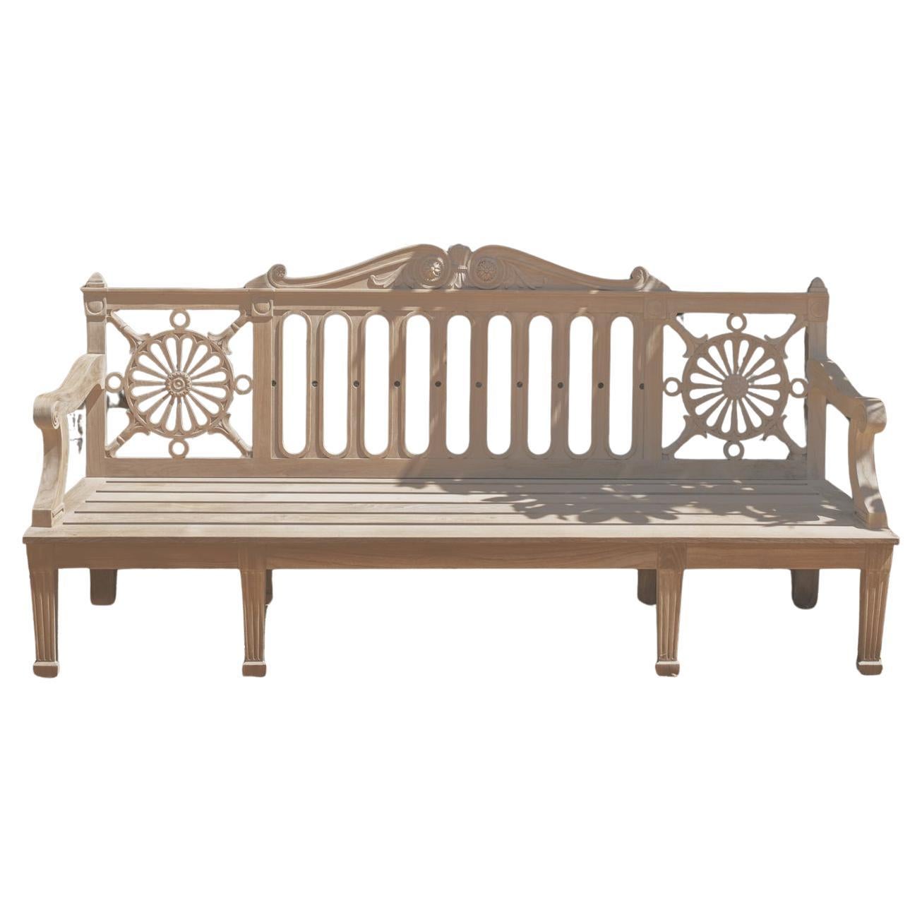 A fine carved teak garden bench designed by Thomas Chippendale for Harewood House in 1774. Exterior seat pads can be supplied if required. Seat pad upholstered in the client’s own ma...
