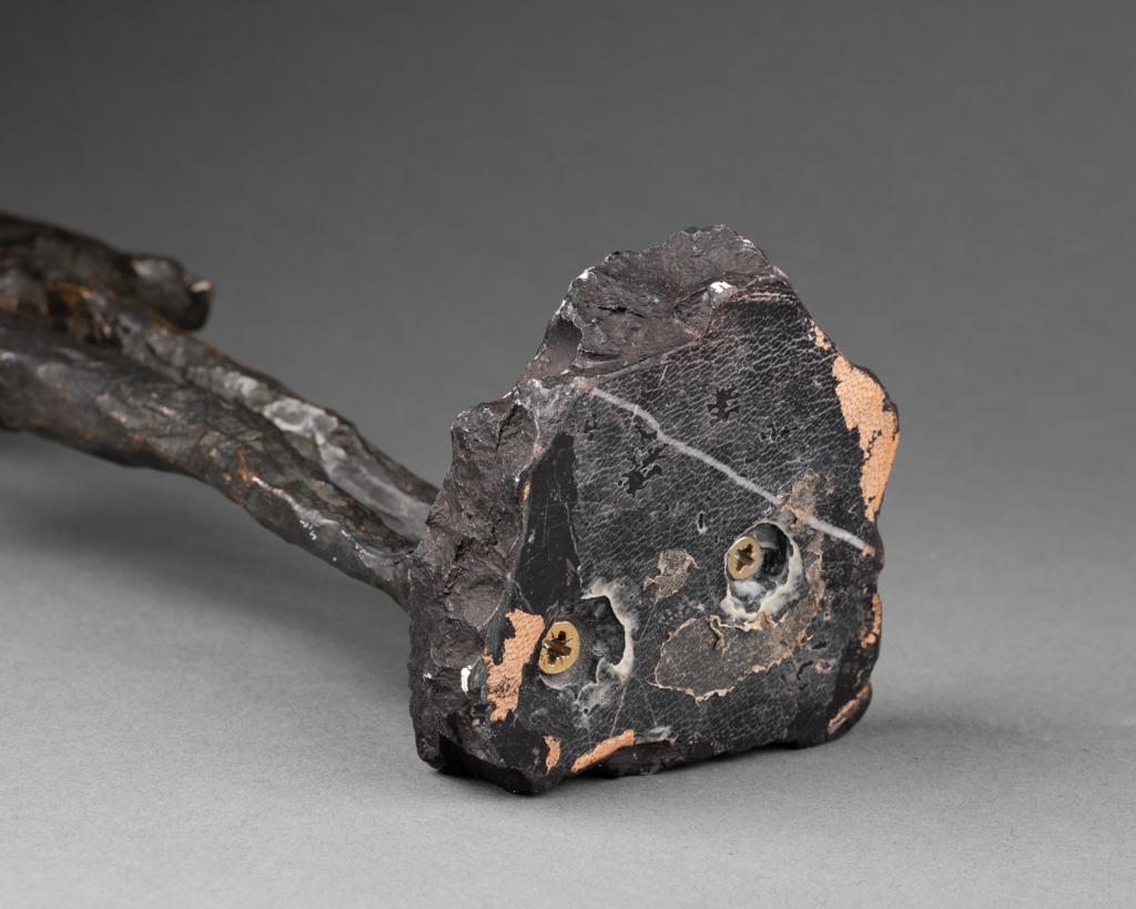 Very dark brown-black varnished patinated bronze sculpture showing a hand holding a flamme