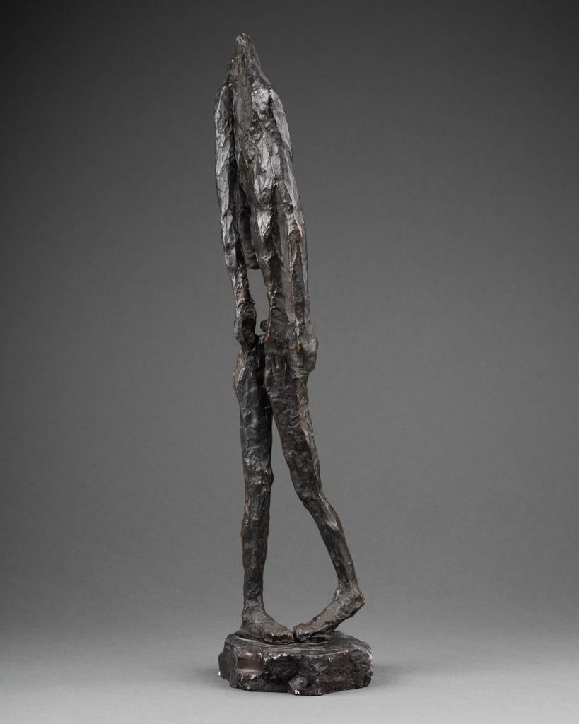 An unusual cast bronze sculpture by Anne Van Kleeck. Elongated figure-exaggerated and inspired by Giacometti. From the artist's estate. A note about the artist: Anne Van Kleeck was primarily known for her works in cast bronze and ceramics. She attended Ohio Wesleyan University (B.A.) and Ohio State University (M.A.) and spent several years as a professor of art in Ohio and Florida. In 1957, Anne traveled to Venice, Italy to study bronze and lost wax casting, beaten iron and mosaic techniques. During that stay she employed an Italian foundry expert and together they established a small foundry on the island of Murano where they cast bronzes for her one woman show in Venice. Van Kleecks work has won multiple awards and is owned worldwide by private collectors and museums, including the Metropolitan Museum and MOMA in New York. She was contemporaries of and exhibited with Ruth Asawa, Gary Knox Bennett...