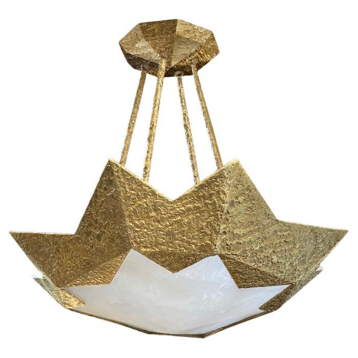 Exceptional Art Deco star-shaped ceiling light in engraved bronze with original gilding, France, 1930s-1940s. Seven lights. This recessed fixture features a 100% original central gla...