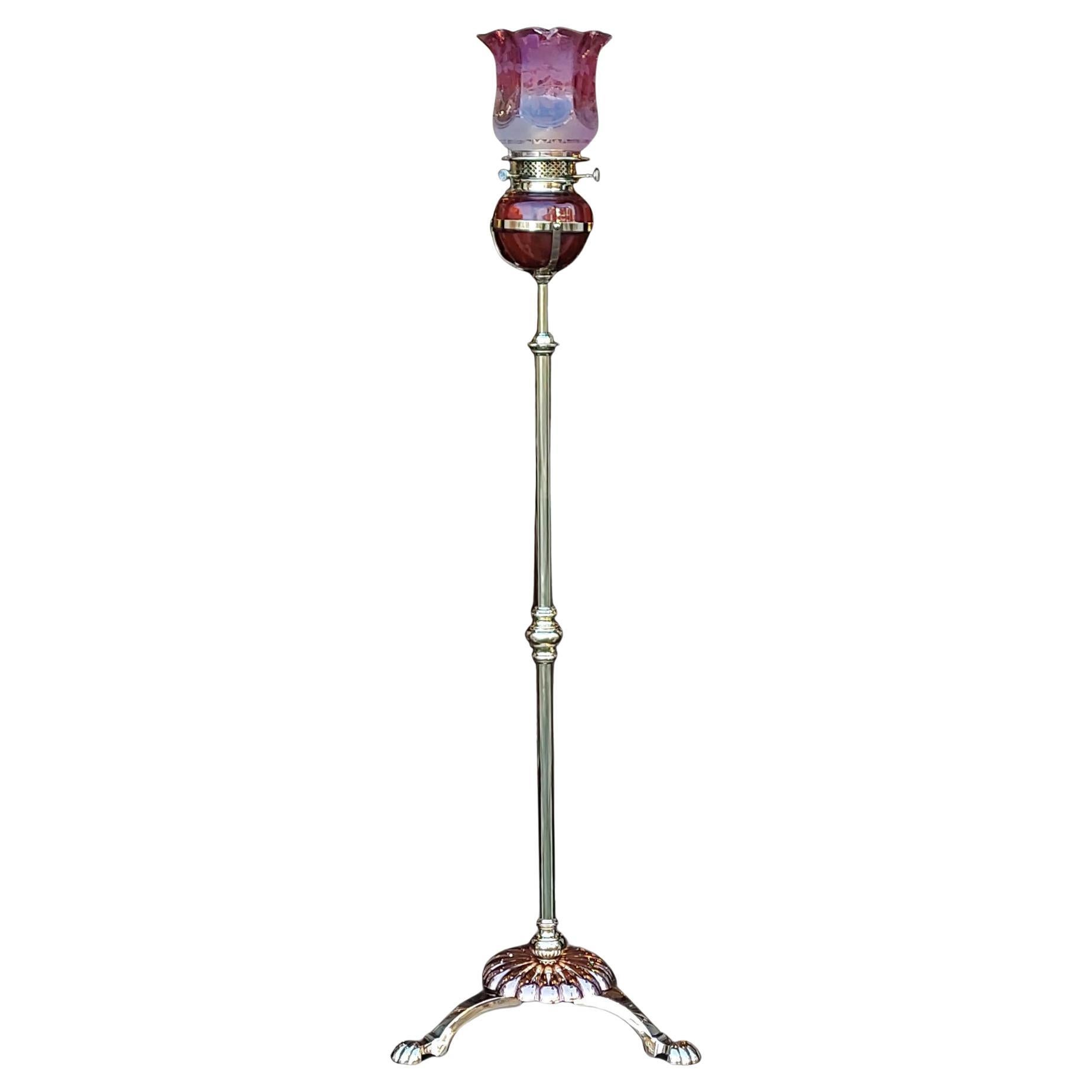 Copper Floor Standing Cranberry Glass Oil Lamp