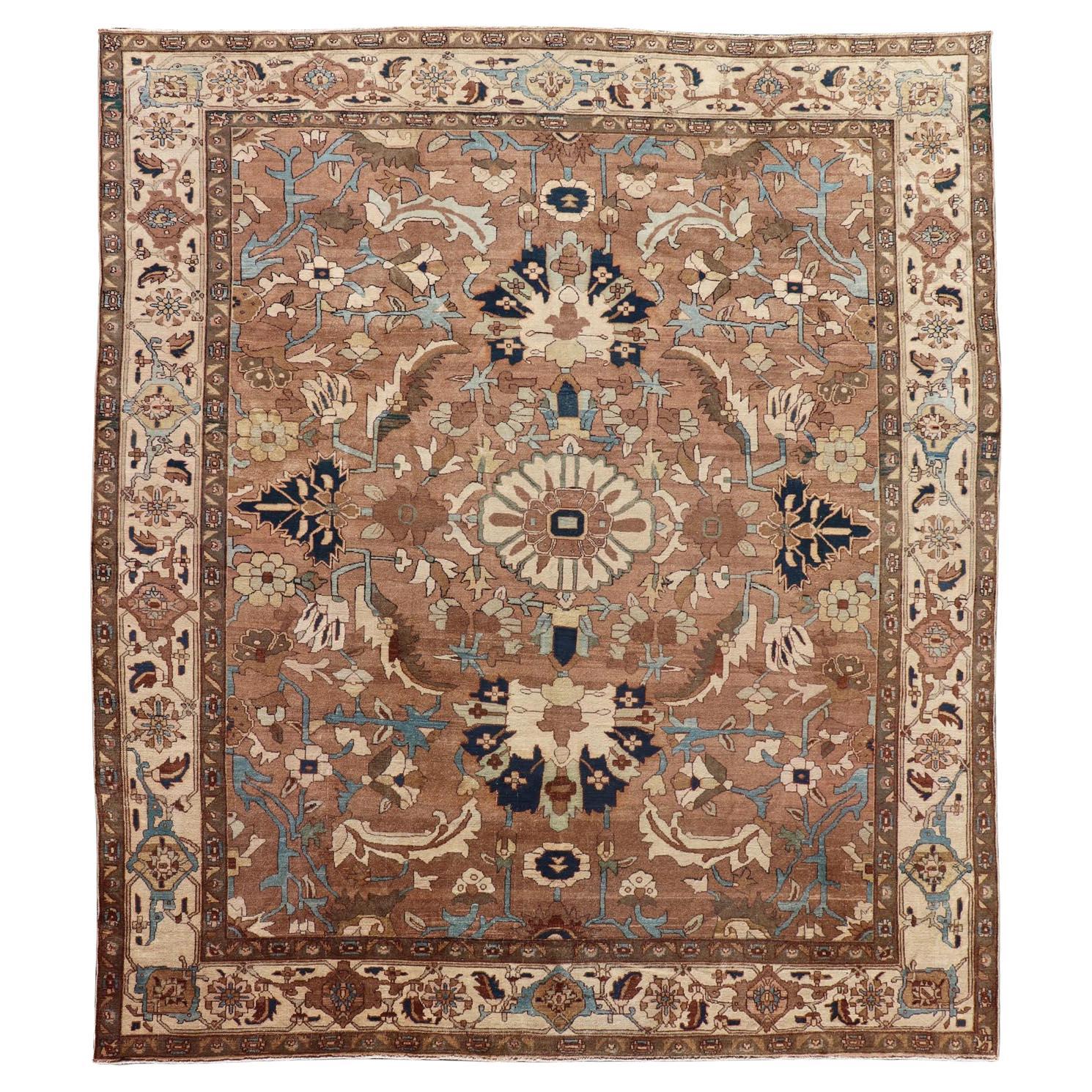 Antique Persian Serapi Carpet, Handmade Rug Ivory, Light Blue, Rusty Red