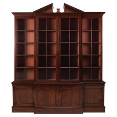 Very fine George III mahogany breakfront bookcase in the manner of Thomas Chippendale, the architectural pediment having egg and dart with dentil molding over similarly treated friez...