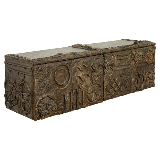 Evans’s later work falls into three distinct style groups. His sculpted-bronze pieces, begun in the mid-1960s, show Evans at his most expressive. He employed a technique in which resin is hand-shaped, and later sprayed with a metal coating, allowing for artistic nuance in the making of chairs, tables and case pieces. Later in the decade and into the 1970s, Evans produced his Argente series for celebrated manufacturer Directional (a brand known to vintage mid-century modern furniture collectors everywhere): consoles and other furniture forms that feature aluminum and pigment-infused metal surfaces welded into abstract organic forms and patterns.