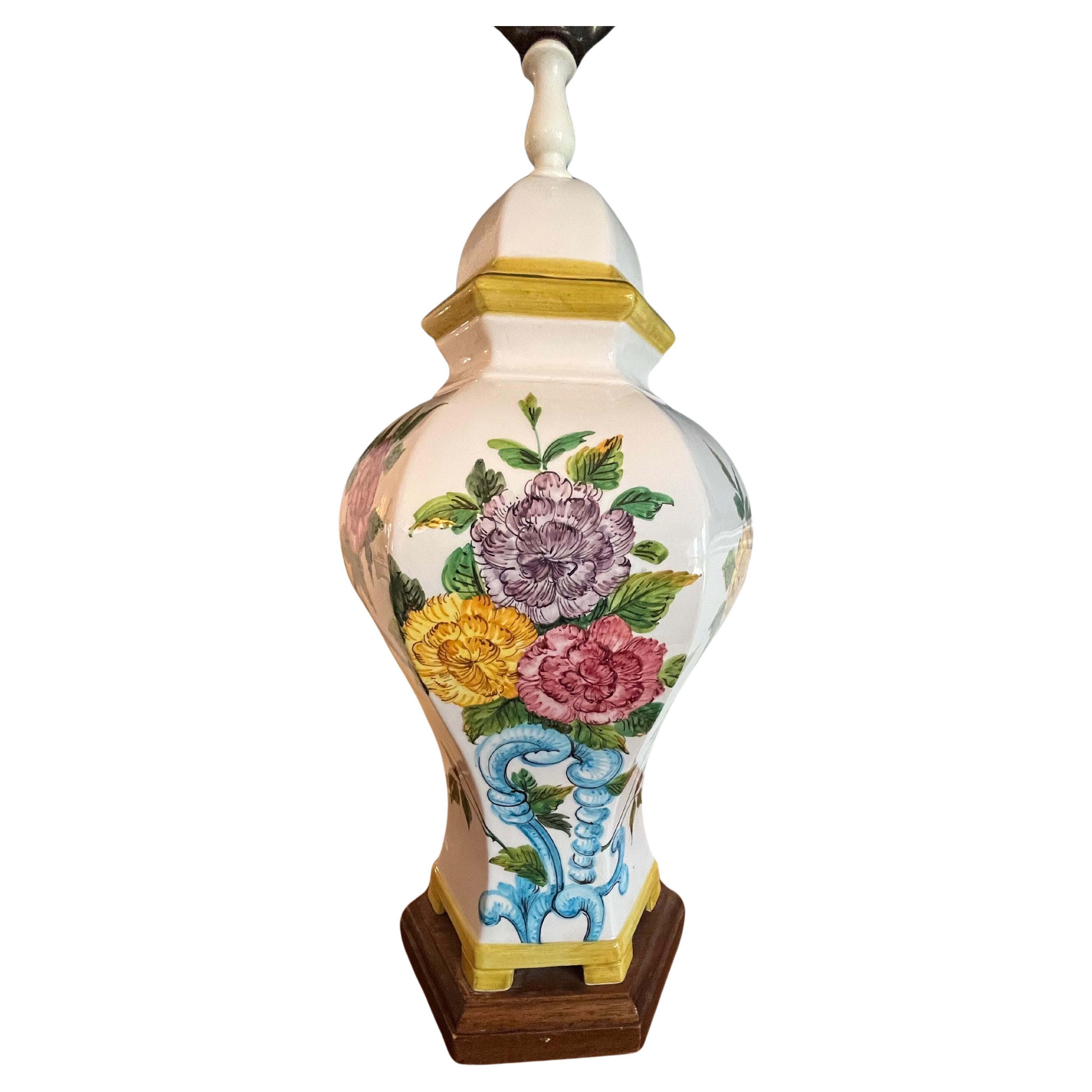 A bold and sculptural ceramic table lamp from the 1980s, featuring a high-gloss glaze and richly hand-painted botanical motif in olive greens, earthy browns and soft ochres. The gene...