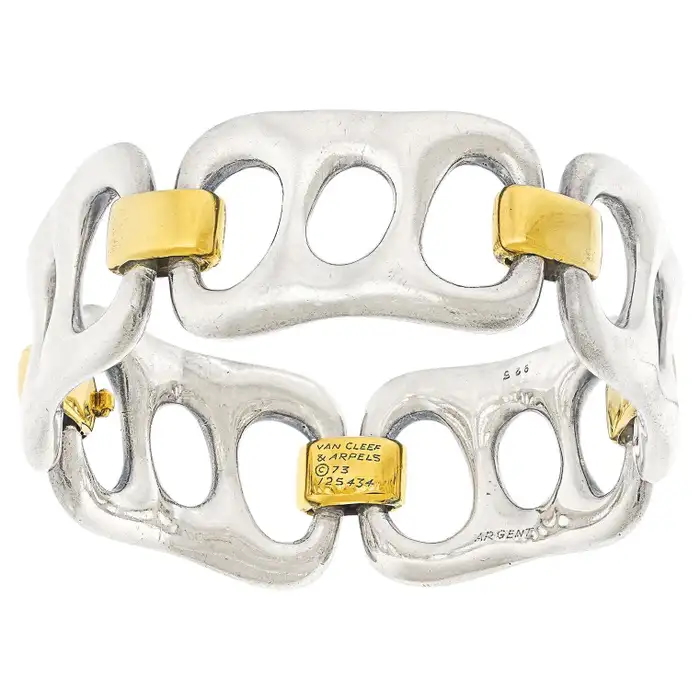 Instead, the Lawrence Jeffrey collection emphasizes distinctive finds like an unsigned 1960s minimalist-meets–Fashion Week 18-karat-gold bangle, a Cleopatra-worthy Olga Finzi collar necklace and an unusual circa-1973 Van Cleef Arpels bracelet in gold and silver, which feels as far away from Alhambra as you can get.