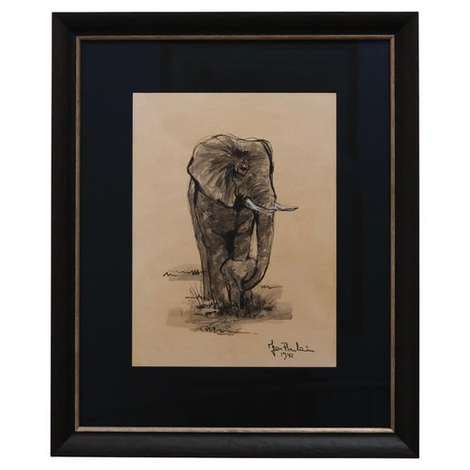 Drawing of an Elephant and Calf, Ink and Wash on Paper by Jean Poulain, 1942