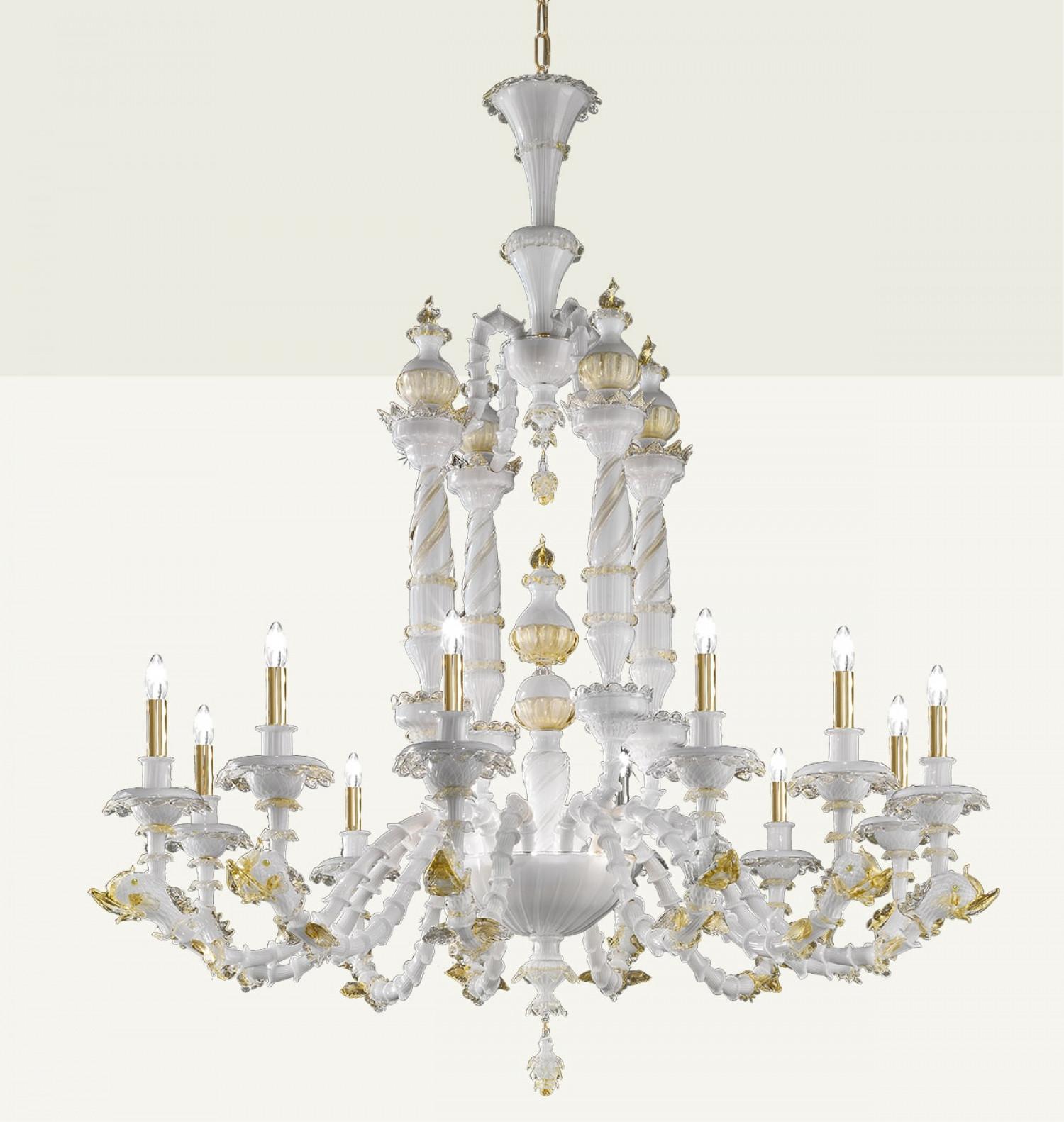 Questo prestigioso lampadario colorato di alta gamma porta la passione dei vetrai di Venezia nella tua casa. I lampadari di Eleg sono da molti anni il punto di riferimento per l'eleganza, la grazia, l'alta qualità e l'eccellente artigianato. Questa enorme coppia di lampadari a 12 luci è grandiosa, riccamente decorata e non può essere ignorata. Questo lampadario è interamente realizzato a mano con bracci ricoperti di piccoli cilindri di colore bianco e dettagli in ambra/oro.