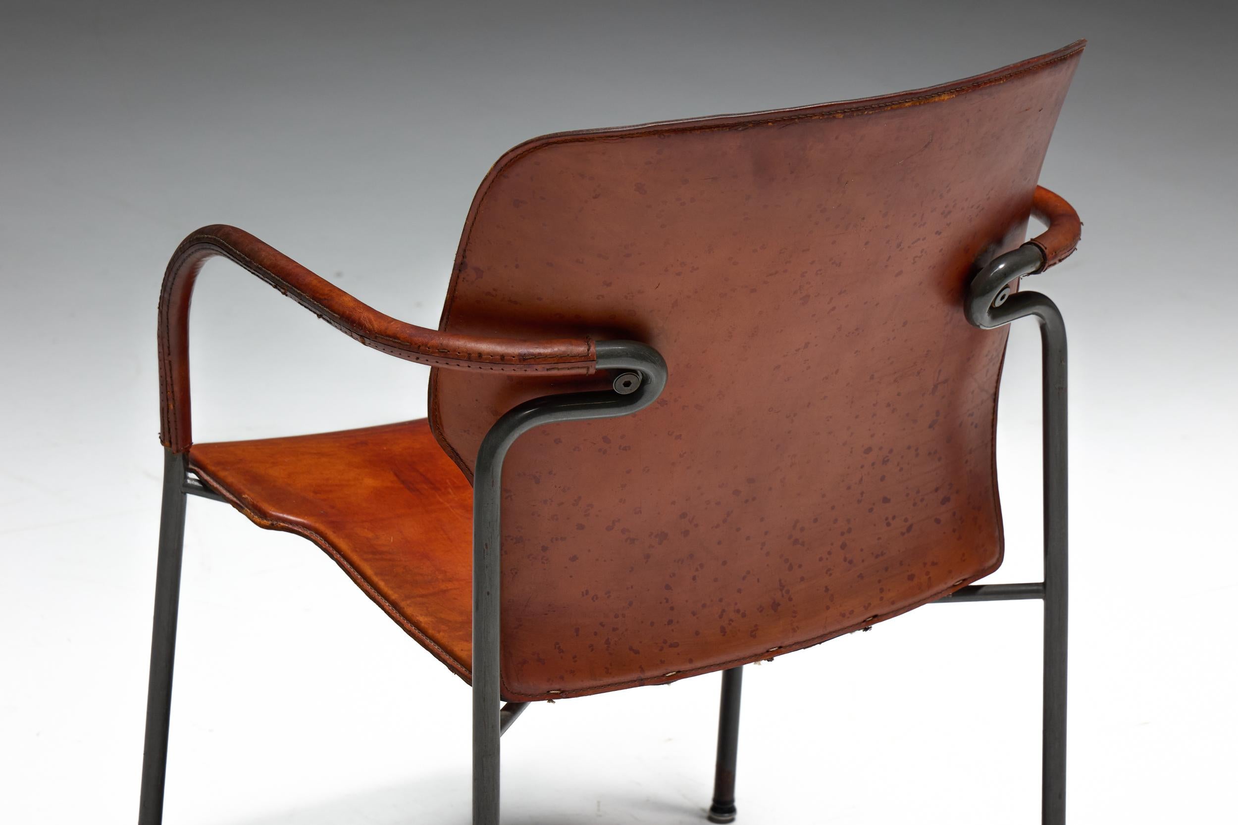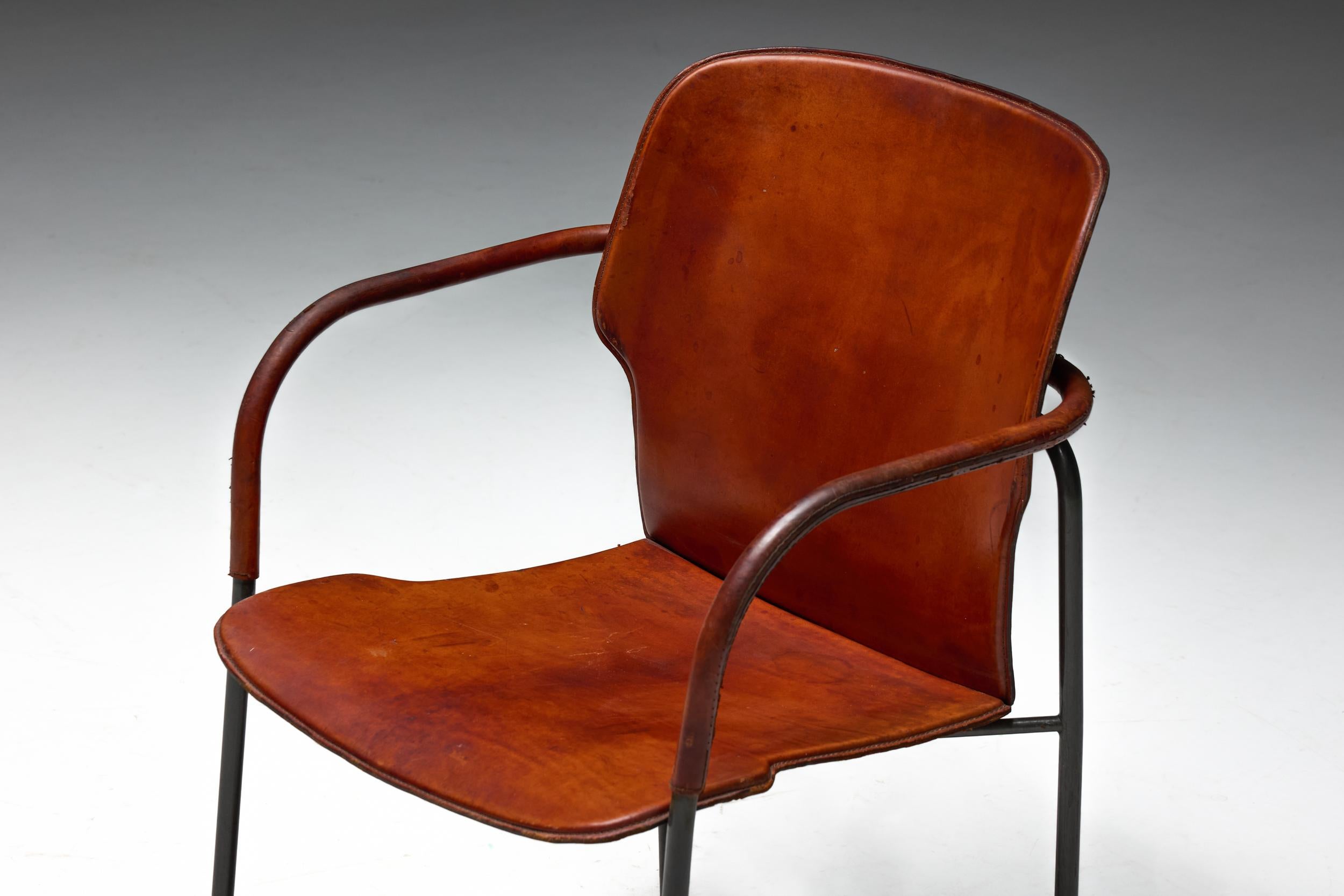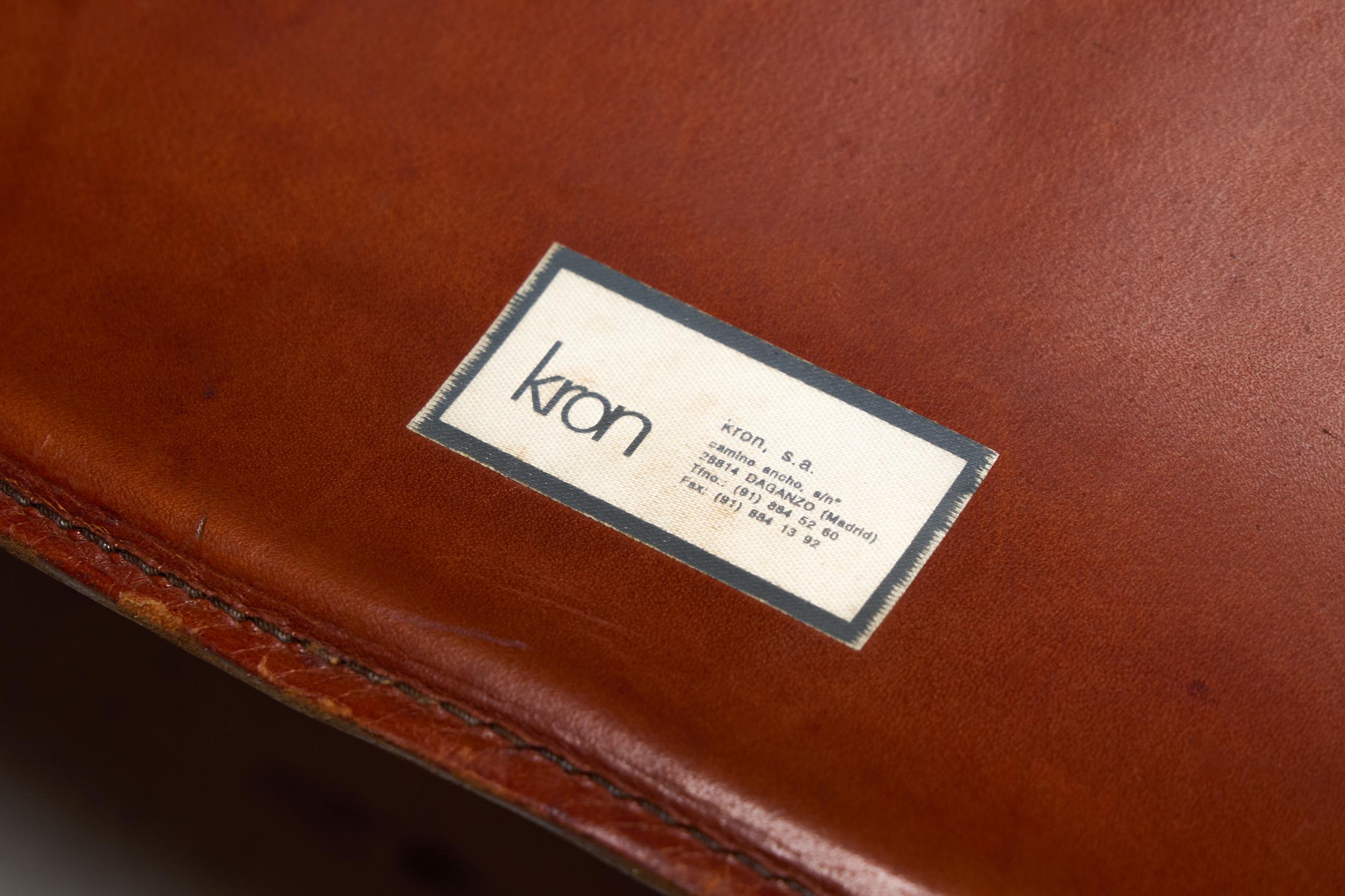 The Lalanda dining chair features a lacquered metal frame paired with rich cognac-whiskey patinated leather. Its minimal, architectural lines are complemented by the warm character of beautifully aged leather. Each chair carries an original fabric label for the Spanish company Kron, adding historical authenticity to the piece. Only two chairs are available, each showcasing unique patina and artisanal detailing. Priced per piece.