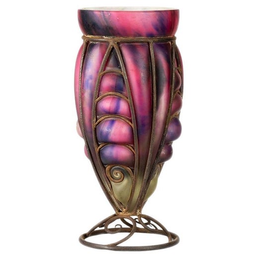 Gli Schneider parteciparono all'Esposizione Internazionale delle Arti Decorative e Industriali Moderne di Parigi del 1925, alla quale Charles fu membro della giuria. L'azienda era al suo apice e stava espandendo sia il suo repertorio di design che il numero di lavoratori, fino a raggiungere i 500 dipendenti. Durante questo periodo, iniziò l'allontanamento dalle forme organiche dell'Art Nouveau verso gli am designs più geometrici dell'Art Deco, con alcuni pezzi che incarnano una sorta di stile di transizione, come questo lampadario. Charles iniziò anche a sperimentare con le polveri pigmentate, vetro finemente frantumato e mescolato con ossidi metallici, che producevano colori brillanti e iridescenti quando venivano applicati su una superficie di vetro.
