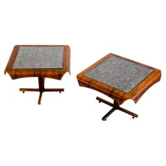Tavolini in stile francese di metà secolo, in legno di frutto, ottone e travertino - Coppia