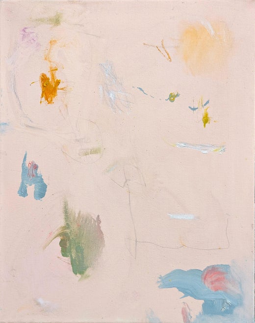 Quadro a olio espressionista astratto dell'artista contemporaneo di Houston Benji Stiles. L'opera presenta segni gestuali e forme arrotondate nei toni pastello del rosa, del verde e ...