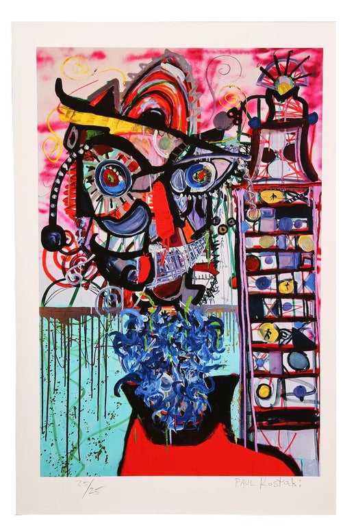 Paul Kostabi è noto per i suoi ritratti selvaggiamente divertenti, espressionistici e colorati. Questo quadro è una perfetta definizione delle sue opere più popolari. Il rosso, i bia...