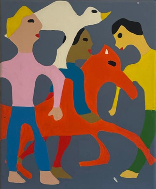 Informazioni sull'artista: James Ulmer (nato nel 1981) è un artista americano noto per le sue rappresentazioni minimaliste e quasi infantili di figure, animali e oggetti quotidiani. Le sue opere sono caratterizzate da linee semplici, colori piatti e un approccio giocoso alla composizione, traendo ispirazione dall'arte popolare, dai cartoni animati e dalle tradizioni della outsider art. I dipinti e i disegni di Ulmer trasmettono spesso un senso di innocenza e di umorismo, mentre affrontano sottilmente i temi della connessione umana e della fisicità. Lo si può vedere nei suoi ritratti semplici ma dinamici di figure muscolose e giocatori di baseball e nelle immagini più astratte di figure che interagiscono tra loro in composizioni luminose e allegre. Ha studiato alla University of the Arts di Philadelphia e vive e lavora a Brooklyn, &New York. Ha tenuto mostre personali presso Eighteen, Copenhagen; The Pit, Los Angeles; The Hole, New York; e PM/AM, Londra.