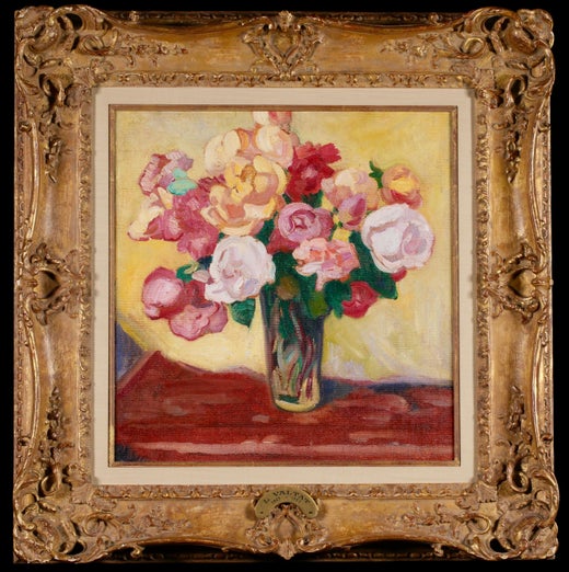 Natura morta fauvista firmata su tela dal pittore francese post-impressionista Louis Valtat. L'opera raffigura un vaso verde pieno di rose in diverse tonalità di rosa su uno sfondo giallo.