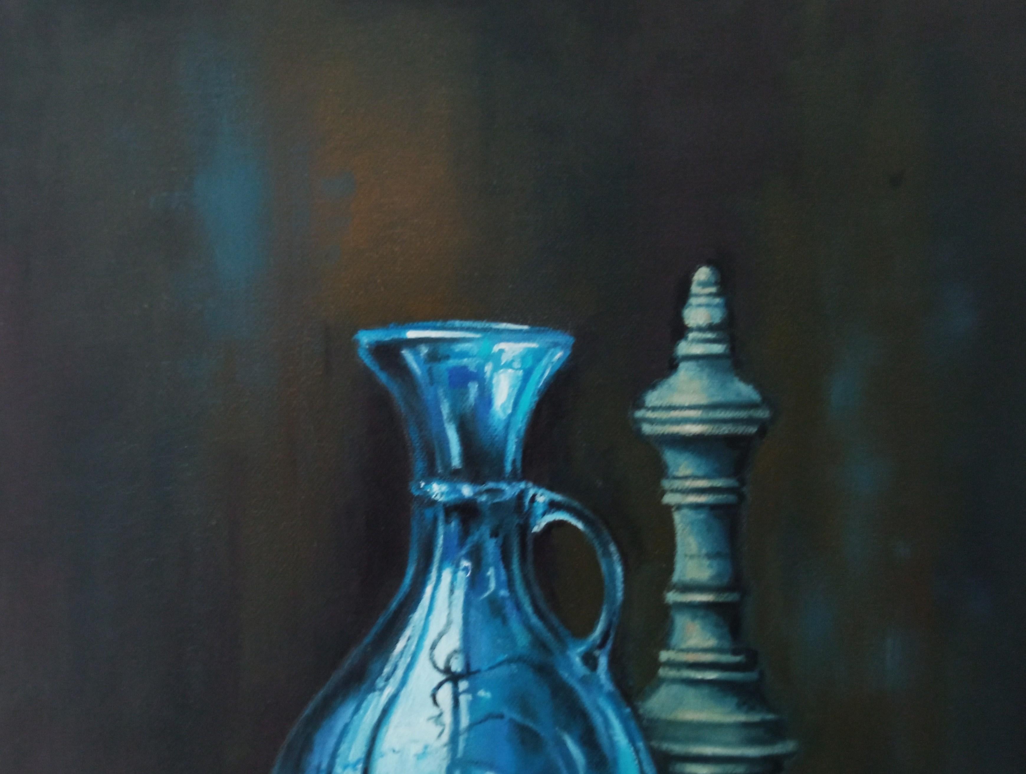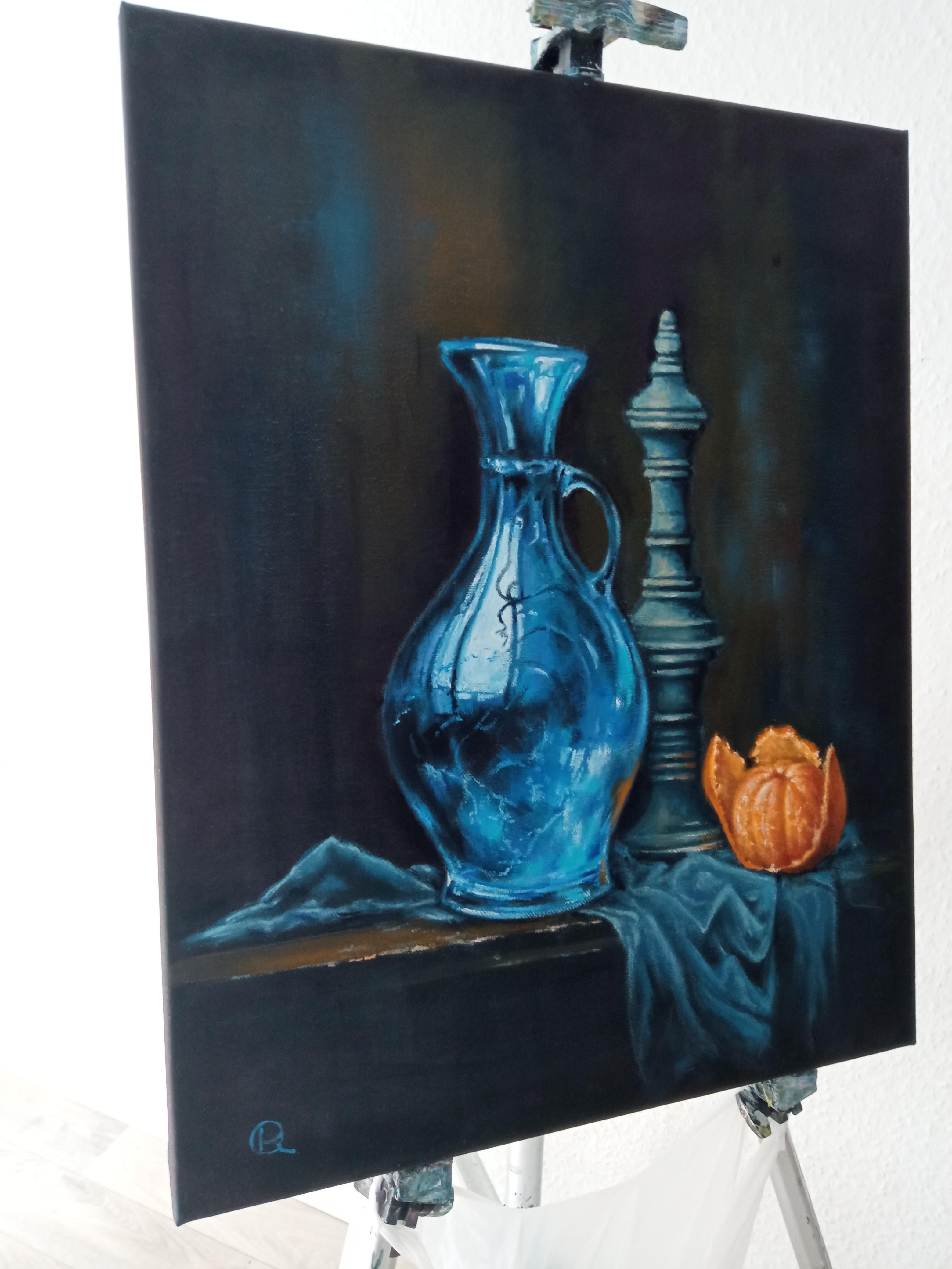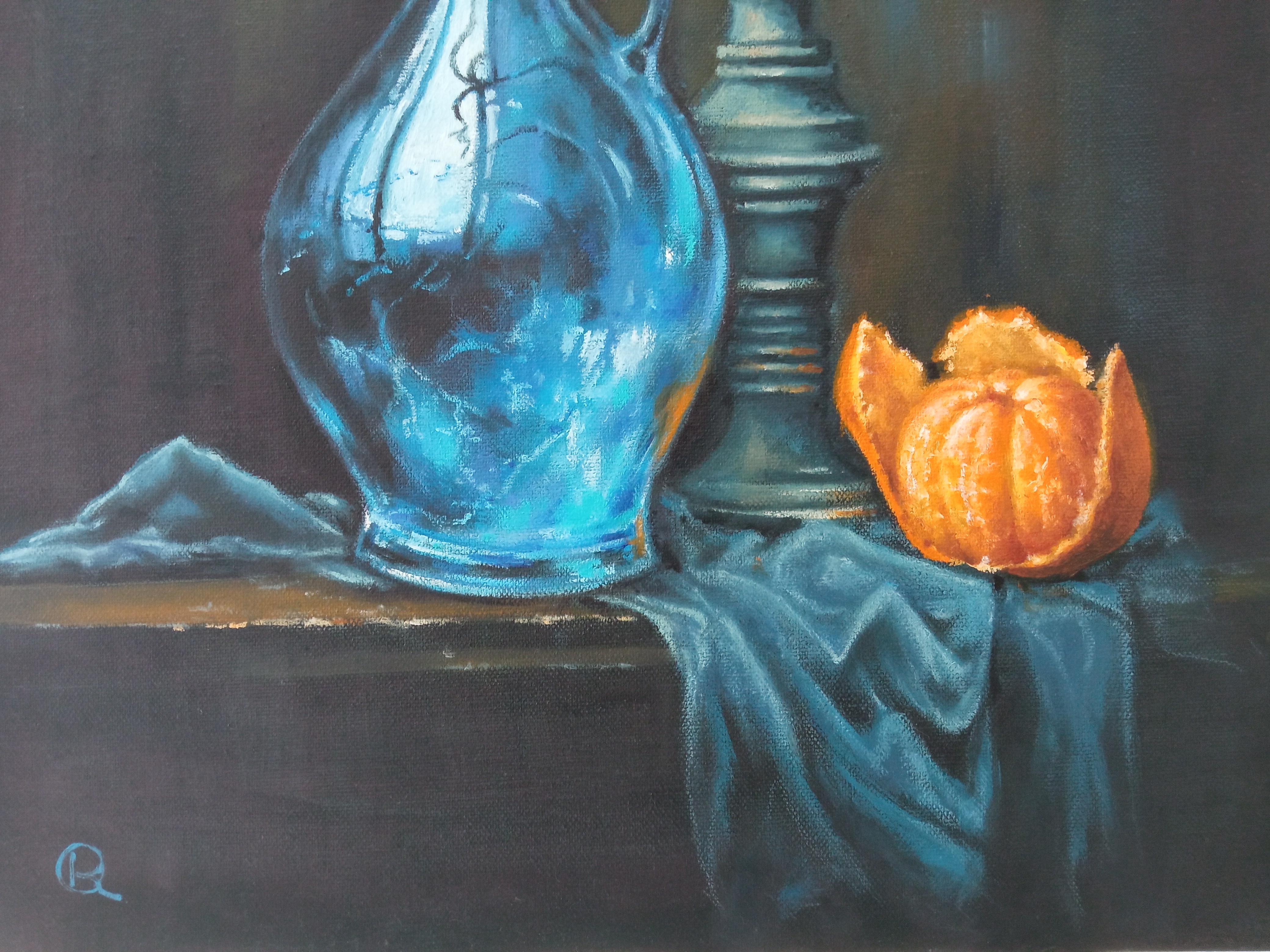 "Natura morta con mandarino" - questo dipinto, ispirato agli antichi maestri, combina lo squisito gioco di luci e ombre con una profonda emozione. Il mandarino luminoso, come se portasse con sé il profumo delle vacanze invernali, contrasta con il blu freddo della brocca di vetro e le linee pulite dell'elemento metallico. È una storia tranquilla sulla bellezza delle cose semplici, raccontata attraverso il linguaggio della pittura.