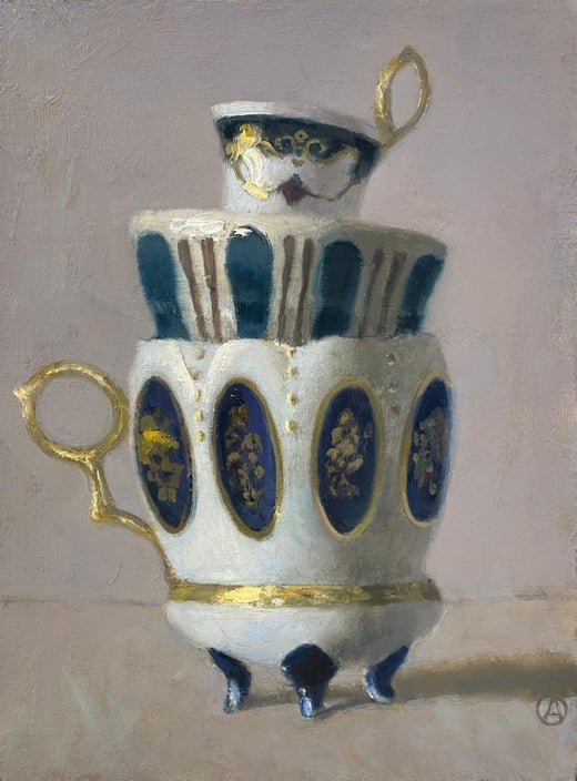 Il soggetto di Olga Antonova sono composizioni di tazze, piatti, teiere e stoviglie straordinariamente eleganti, belle e stravaganti, ma c'è qualcosa di giocoso in questi dipinti. Le tazze da tè impilate sono anche divertenti e hanno una sorta di personalità sbarazzina e allegra. I pois piacciono tanto agli adulti quanto ai bambini, e tutti rispondono ai loro gusti. I colori e gli scintillii dell'oro e dell'argento, mentre ci si meraviglia dell'abilità di Antonova di dipingere questi dettagli radiosi senza alcuno sforzo. Quest'opera in particolare include un doppio autoritratto dell'artista al suo cavalletto visto come riflesso nelle due tazze di metallo. Le composizioni di Antonova sono un meraviglioso stravolgimento delle tradizioni classiche e della formalità solitamente associata alla pittura di nature morte. Quest'opera non è incorniciata.