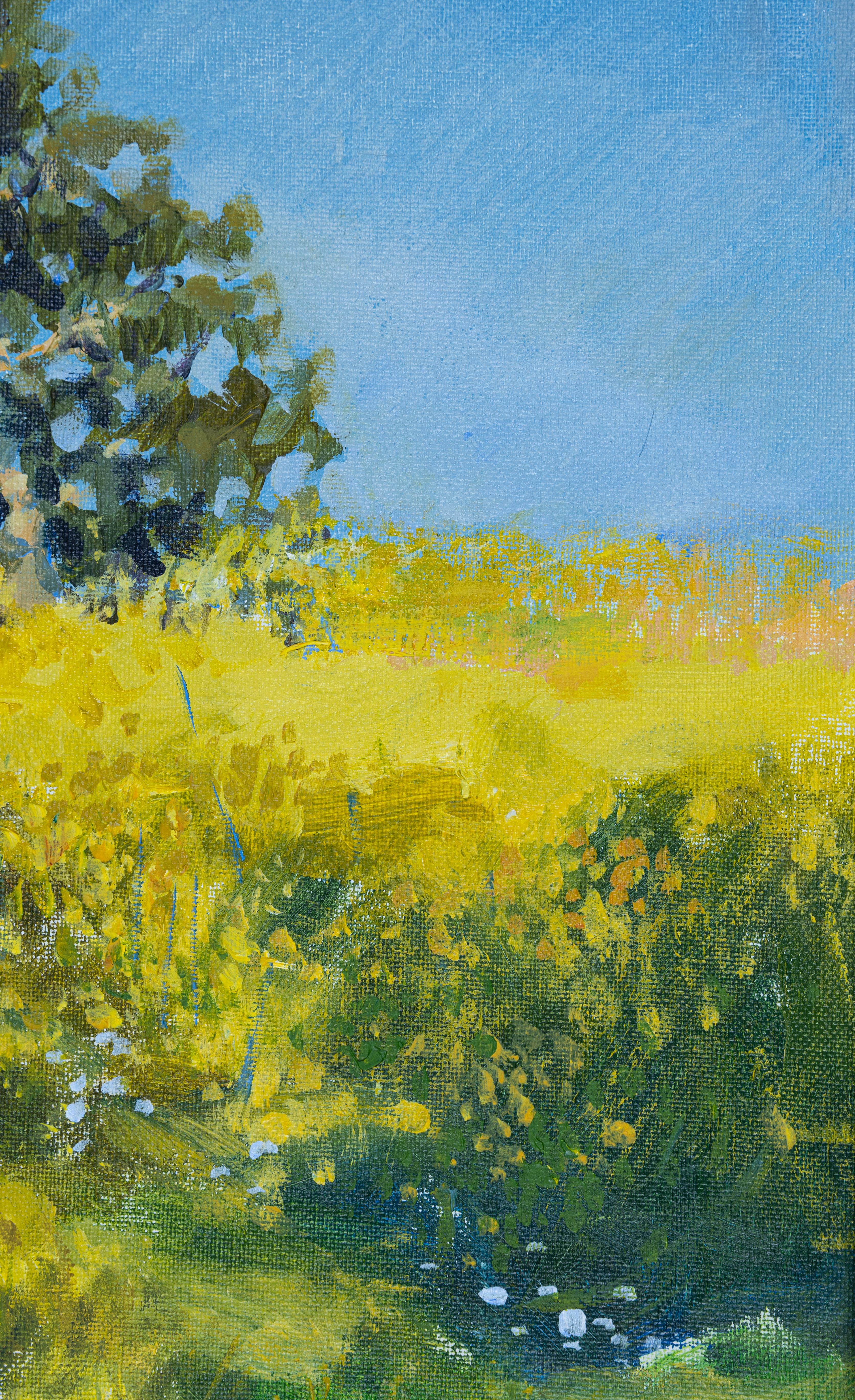 Field Painting 4 giugno 2021, Paesaggio estivo, albero verde, fiori gialli