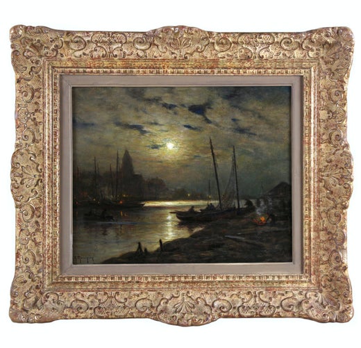 Mostra tuttoScena costiera e pescherecci al chiaro di luna, pittura a olio francese Di G. Maroniez