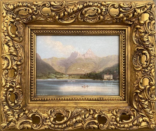 19th century English artist painting a Swiss Lake landscape with boats cottages