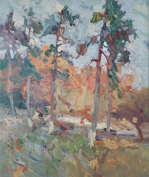 Ecco un incantevole dipinto "Fiori di albicocca". Twilight" è una riflessione poetica di una sera di primavera del maestro della pittura ucraina contemporanea Oleksandr Khrapachov. Creata nel 2018, quest'opera di 55x70 cm affascina per la sua profondità atmosferica e l'abile esecuzione.