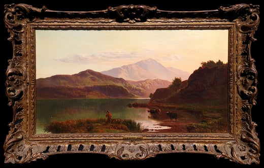 Mostra tuttoPaesaggio gallese dipinto a olio con bestiame vicino al fiume Llugwy, nel Galles del Nord