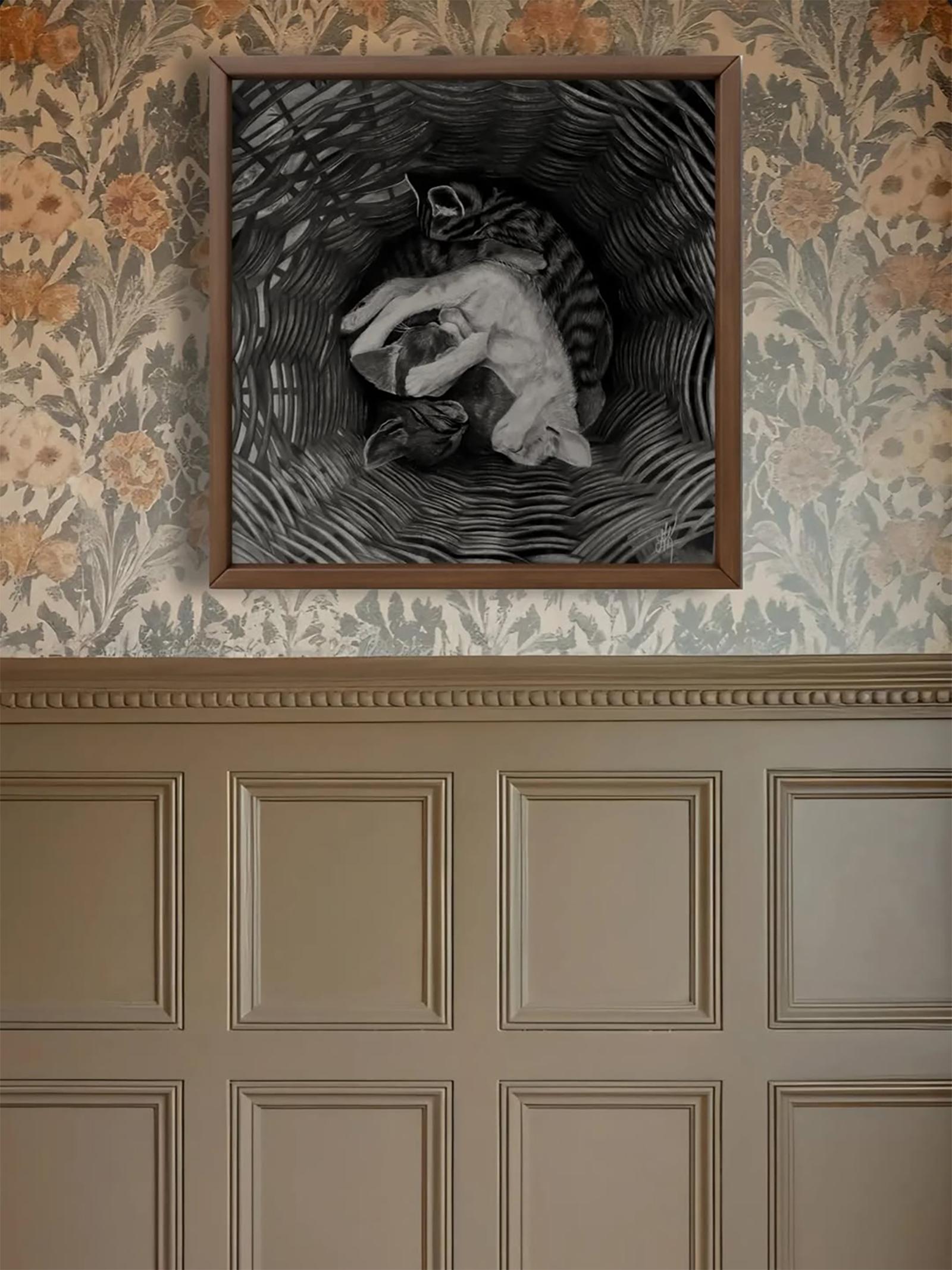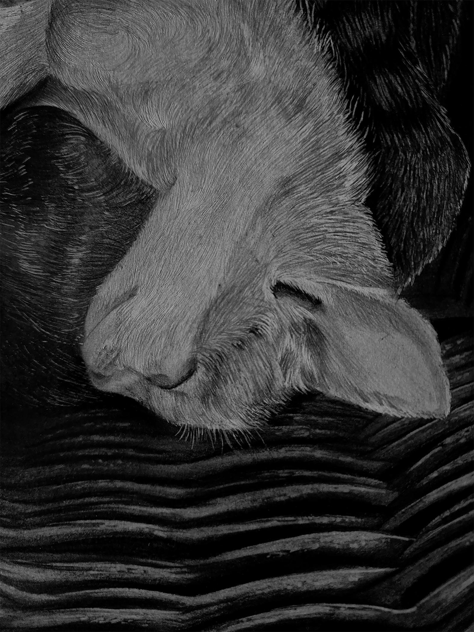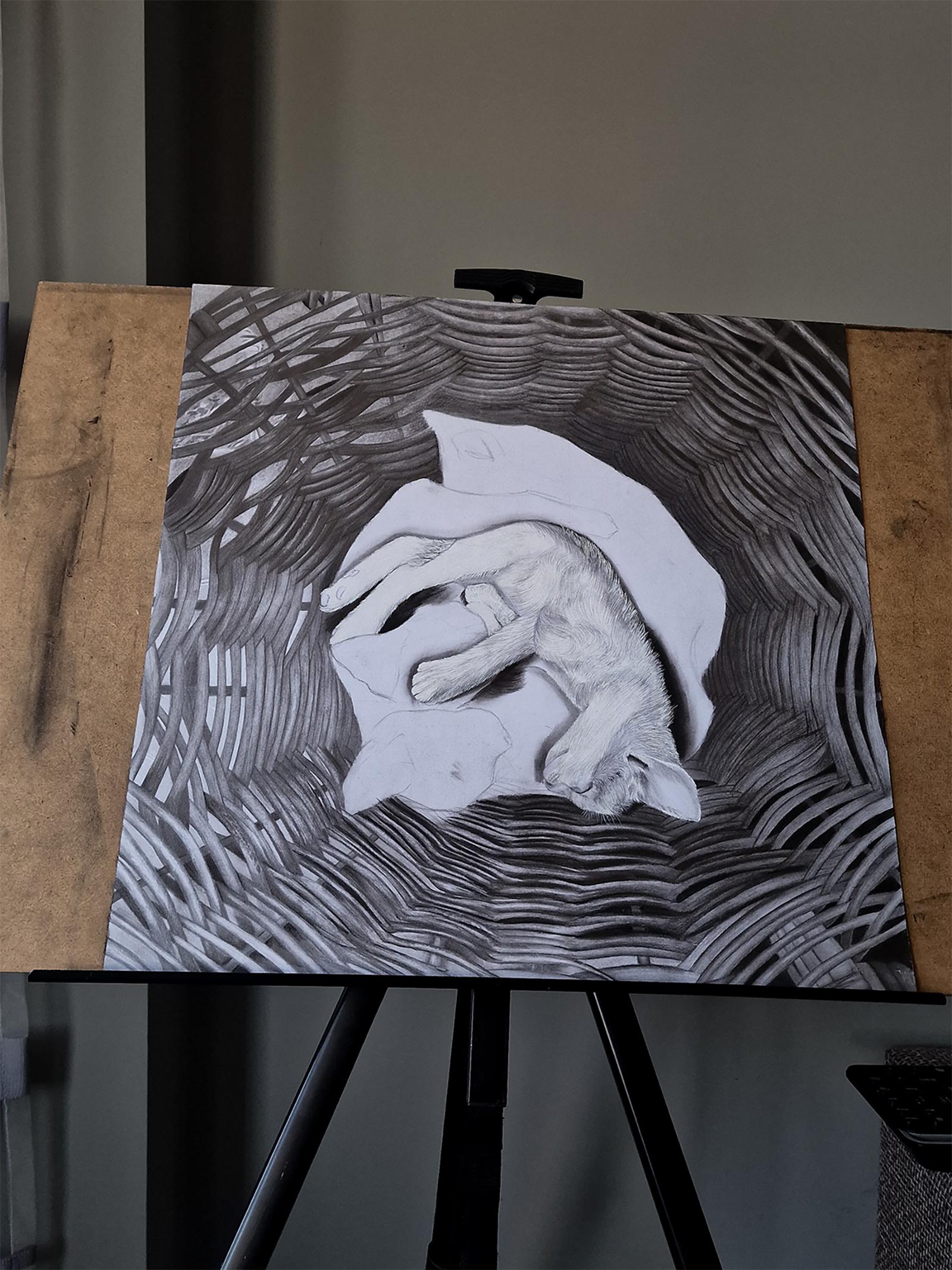 Pomeriggio - Disegno a carboncino contemporaneo del 21° secolo di un gatto