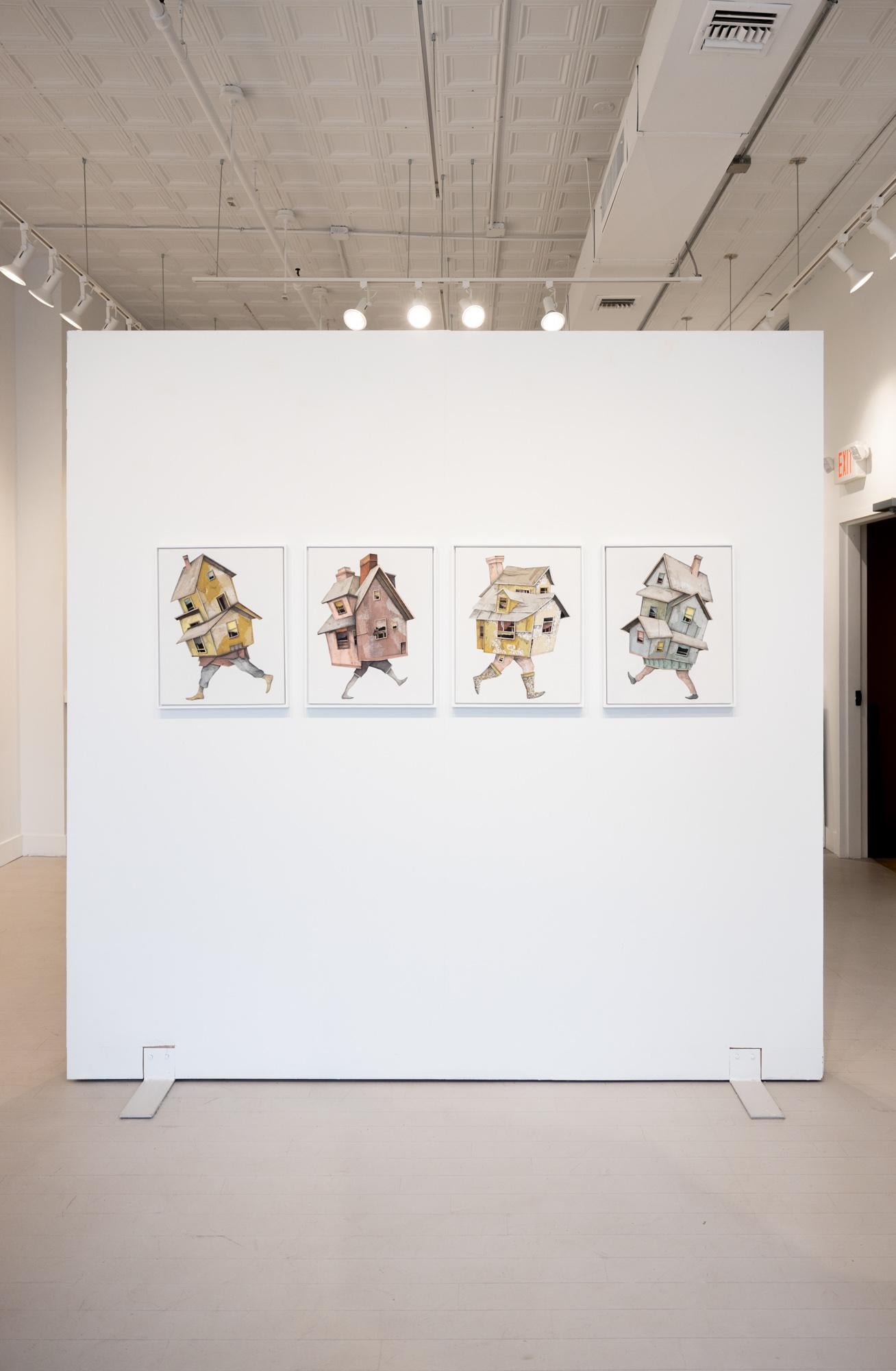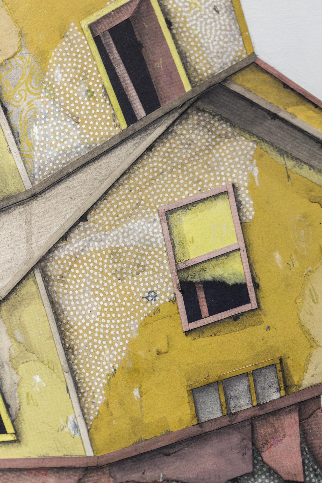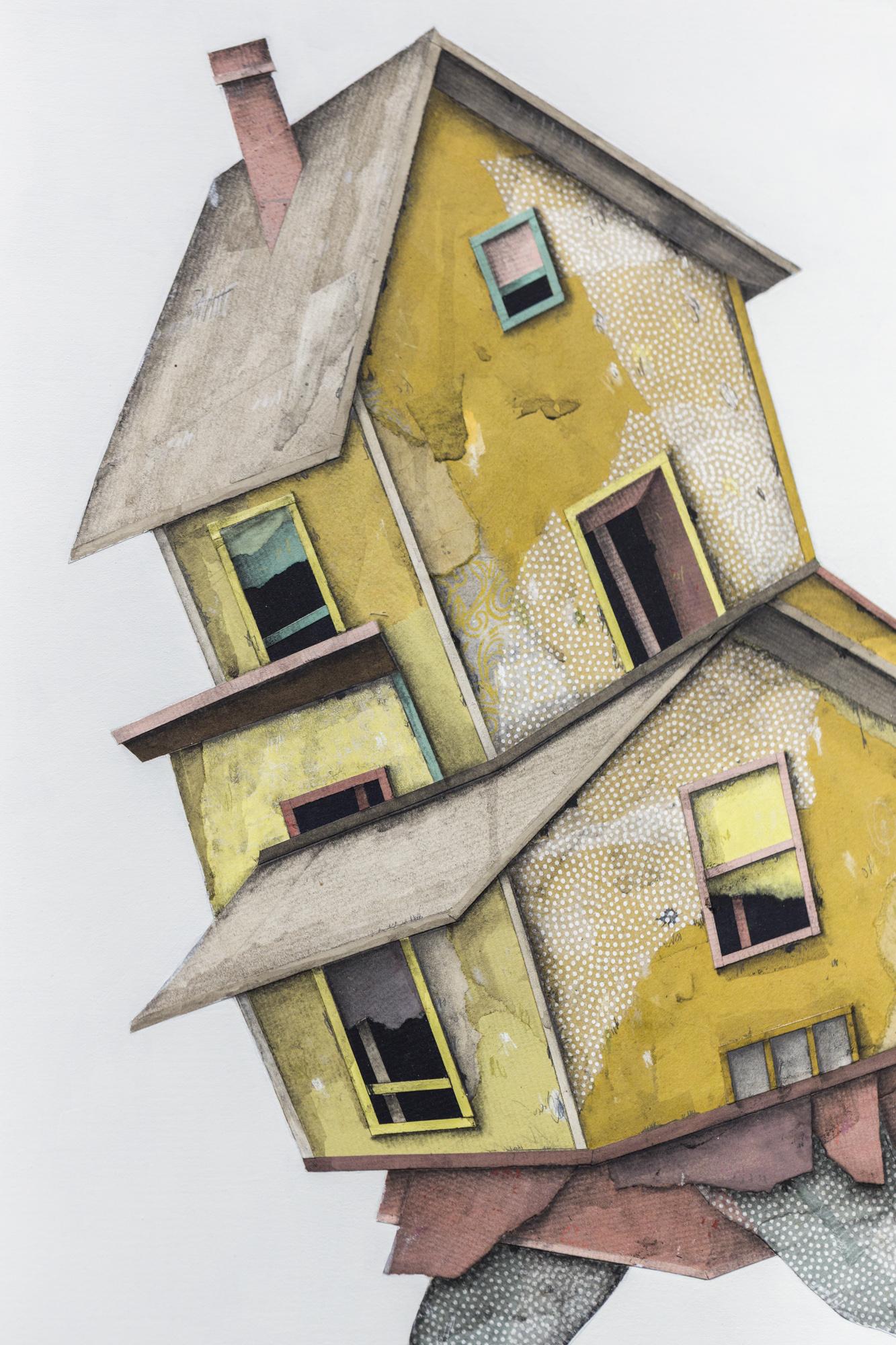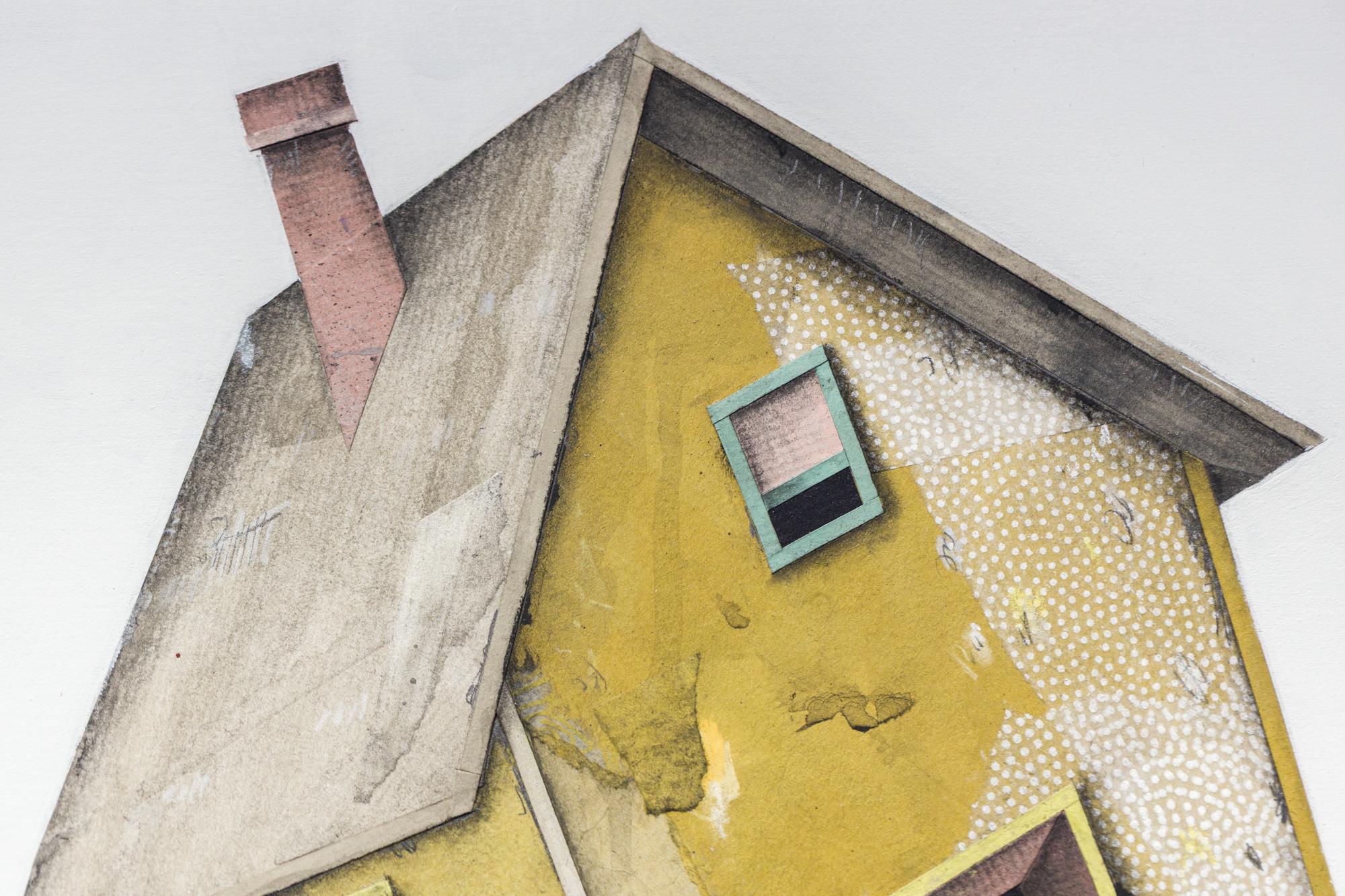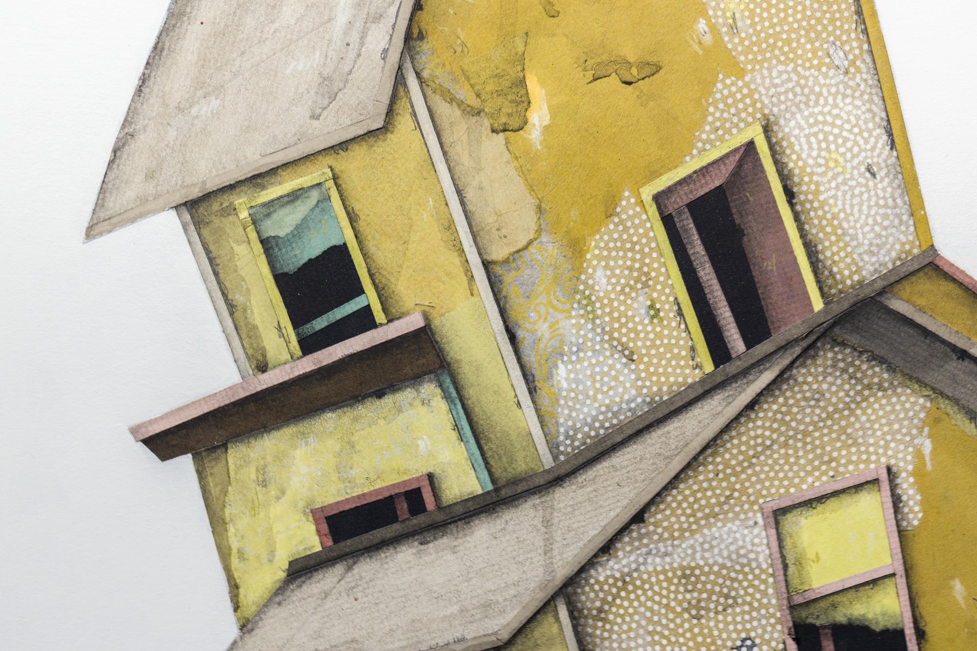 SULL'ARTE Il mio lavoro si concentra sul deterioramento dell'architettura. Vedo un'onestà intrinseca nel volto del mio soggetto. Queste strutture create dall'uomo, progettate per essere enormi forze di permanenza, stanno ora collassando su se stesse. Tra tutto il disordine - frammenti di legno e strati di macerie - rimane una dolce determinazione. È come se gli edifici fossero soddisfatti della loro situazione. Mentre lavoro, studio incessantemente queste strutture. Sono sull'orlo della rovina, ma appaiono dignitosi nel loro stato. Qualcosa di molto energico e presente sta cercando di uscire da una lenta storia di abbandono. Queste immagini sono state create attraverso un ambizioso processo di stratificazione. Faccio collage con carta trovata per riflettere la tattilità frammentata e complessa del decadimento. Una volta ottenuta una base dimensionale, vengono utilizzati vari mezzi misti per dare definizione e profondità a questi materiali grezzi. I processi di collage e disegno si alternano tra loro, dando vita a una fusione perfetta dei due mezzi.