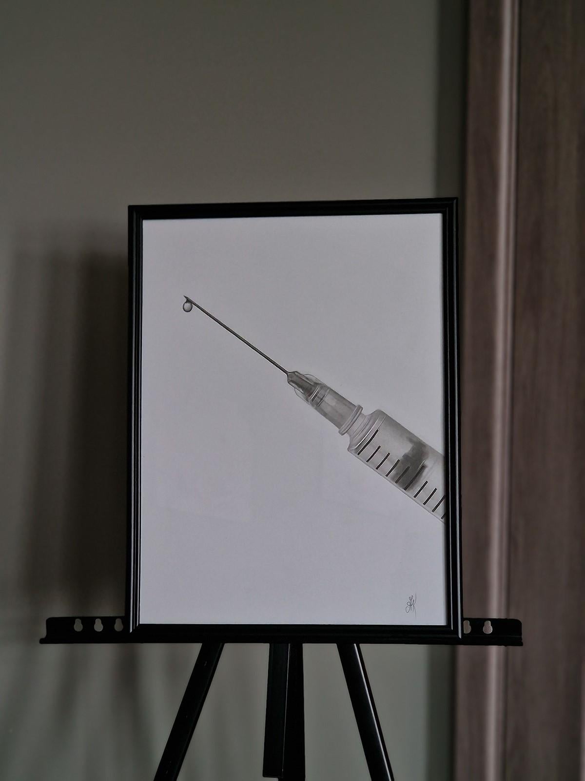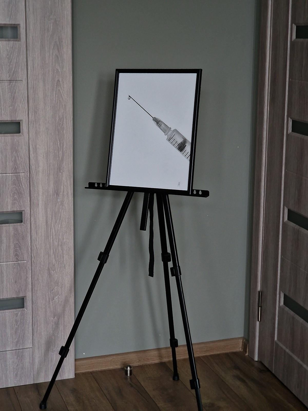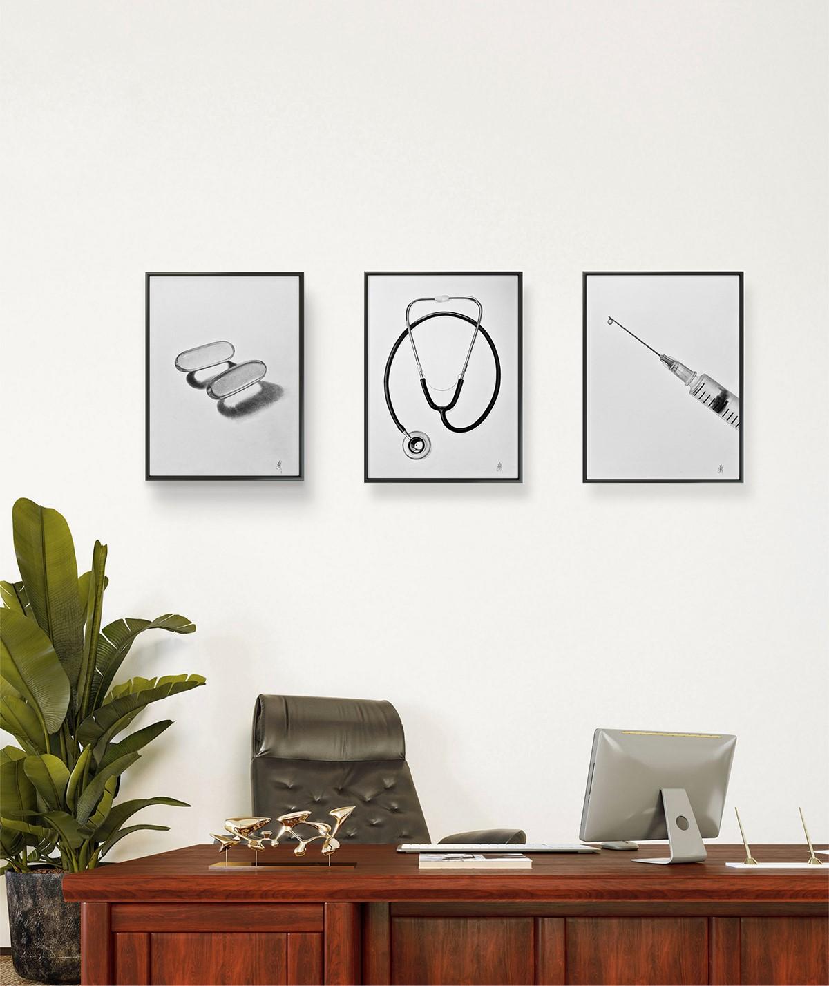 "Doctor I" - la prima opera della serie "Portraits Without Faces". È incorniciato da una cornice nera e da un vetro lucido.