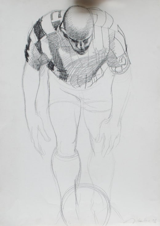 This dynamic drawing captures a Juventus player mid-air in an acrobatic fall, emphasizing movement, strength, and athleticism. The precise strokes of Marco Silombria highlight the intensity of the moment, reflecting his admiration for the classical ideals of the human body. Part of a series celebrating Juventus' triumph in the 1995-96 UEFA Champions League, the artwork embodies the energy and spirit of that victorious season.
