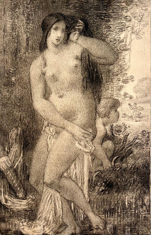 Questo delicato disegno a grafite di William Perkins Babcock cattura un momento intimo e senza tempo tra una donna e un bambino. Conosciuto per la sua raffinata abilità nel disegno e per la sua sensibilità nei confronti delle forme umane, il lavoro di Babcock in quest'opera è uno studio sulla grazia e sull'emozione. Le figure nude sono rese con una squisita attenzione all'anatomia e ai dettagli, evidenziando le curve naturali e le espressioni sottili che trasmettono una profonda connessione tra i soggetti. Le ombreggiature delicate e le linee morbide creano un senso di calore e tenerezza, mentre lo sfondo minimalista permette alle figure di essere al centro della scena. Questo disegno è un bellissimo esempio della capacità di Babcock di evocare una narrazione potente attraverso la semplicità e l'abilità tecnica. Questo quadro è in condizioni eccellenti!