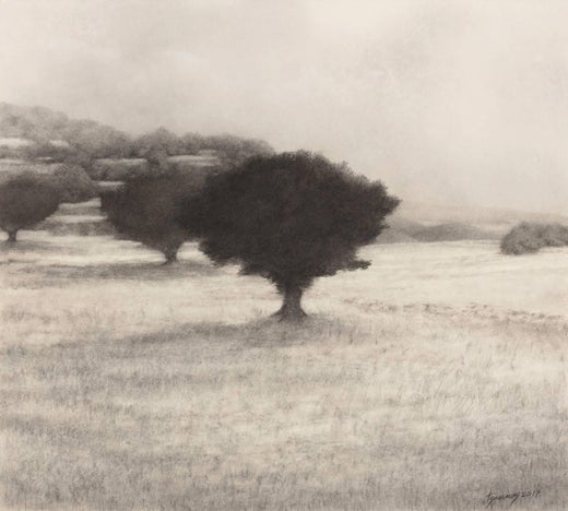Oliveto con colline in lontananza - Disegno a carboncino, Isola Greca, Paese