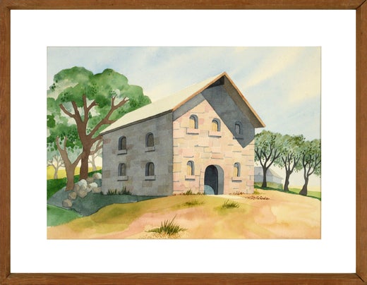 Gretchen GuardFienile di pietra in cima alla collina, acquerello paesaggistico del 19701976