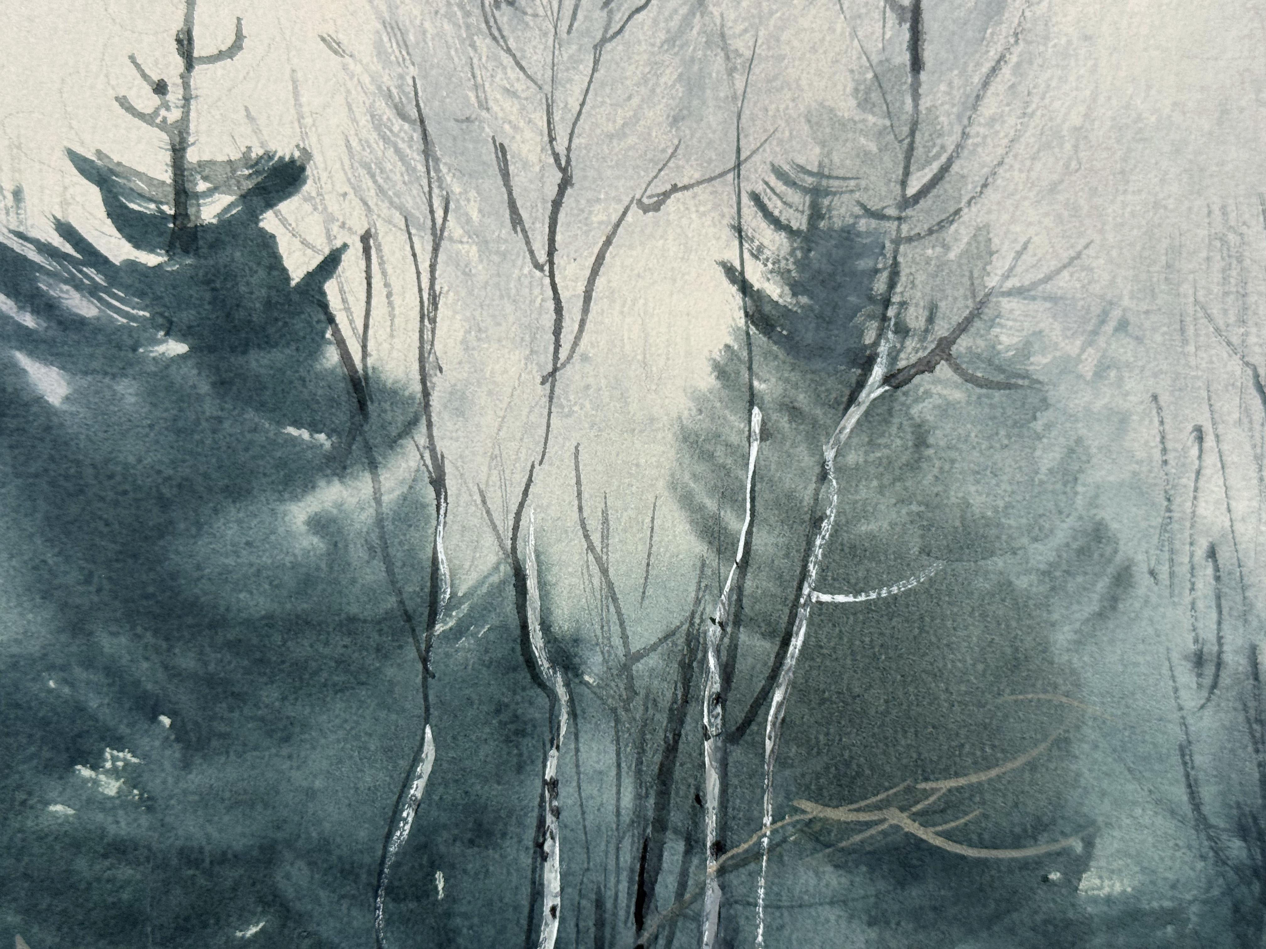 The painting's palette is rich in deep, muted blues and subtle grays and greens, creating a serene, almost meditative mood. The foreground features towering evergreens and the ghostly presence of bare, slender tree trunks, rendered with expressive brushwork that disappears into the dense, hazy backdrop. The low horizontal wash of warm earth tones at the base grounds the ethereal scene.
